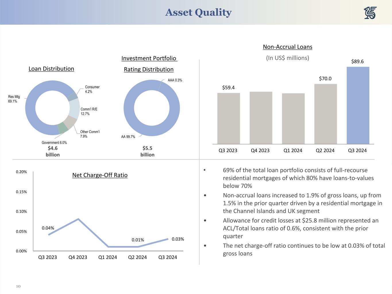 9 Balance Sheet Total Assets (In US$ billions) • Period end deposit balances increased by $0.7 billion to $12.7 billion compared to December 31, 2023 • Average deposit balances increased by $0.6 billion over the fourth quarter of 2023 to $12.4 billion • Butterfield’s balance sheet remained low in risk density (risk weighted assets/total assets) at 33.2% vs Q4 2023 (In US$ millions) Q3 2024 Q4 2023 % Cash and cash equivalents $ 2,067 $ 1,647 26 % Reverse Repos & S/T Investments 1,750 1,225 43 % Investments 5,468 5,292 3 % Loans (net) 4,648 4,746 (2) % Other Assets 441 464 (5) % Total Assets $ 14,373 $ 13,374 8 % Int. Bearing Deposits $ 10,317 $ 9,330 11 % Non-Int. Bearing Deposits 2,420 2,657 (9) % Other Liabilities 571 384 49 % Shareholders’ Equity 1,064 1,004 6 % Total Liab. & Equity $ 14,373 $ 13,374 8 % $13.2 $13.9 $14.4 $5.3 $5.2 $5.5 $4.7 $4.6 $4.6 Total assets Investments Loans Q3 2023 Q4 2023 Q1 2024 Q2 2024 Q3 2024 $11.9 $12.5 $12.7 Q3 2023 Q4 2023 Q1 2024 Q2 2024 Q3 2024 Total Deposits (In US$ billions)