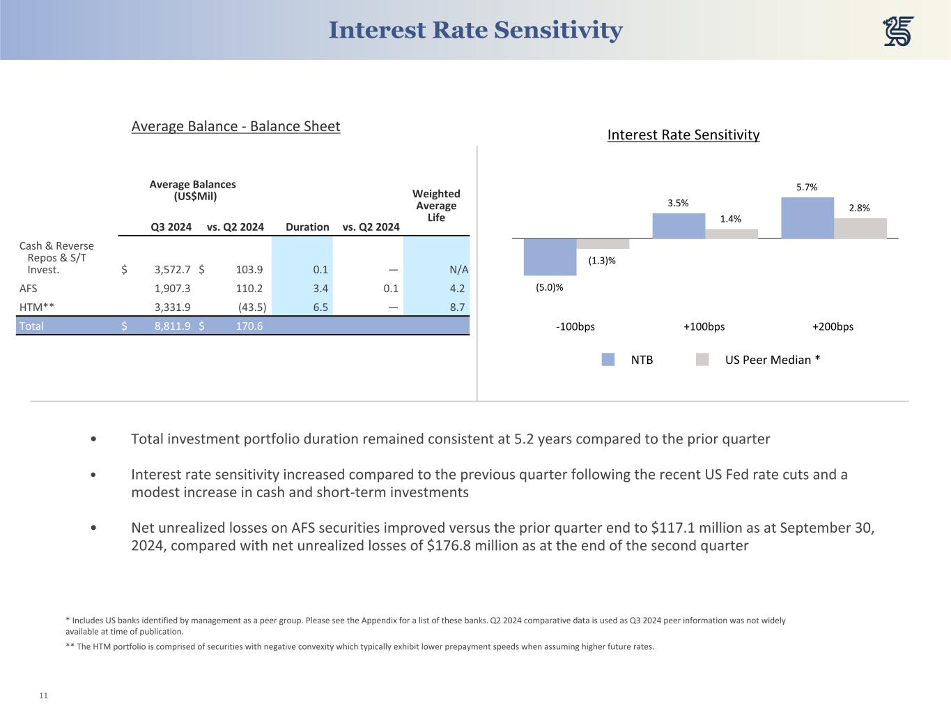 11 Interest Rate Sensitivity Interest Rate SensitivityAverage Balance - Balance Sheet Average Balances (US$Mil) Weighted Average Life Q3 2024 vs. Q2 2024 Duration vs. Q2 2024 Cash & Reverse Repos & S/T Invest. $ 3,572.7 $ 103.9 0.1 — N/A AFS 1,907.3 110.2 3.4 0.1 4.2 HTM** 3,331.9 (43.5) 6.5 — 8.7 Total $ 8,811.9 $ 170.6 (5.0)% 3.5% 5.7% (1.3)% 1.4% 2.8% NTB US Peer Median * -100bps +100bps +200bps • Total investment portfolio duration remained consistent at 5.2 years compared to the prior quarter • Interest rate sensitivity increased compared to the previous quarter following the recent US Fed rate cuts and a modest increase in cash and short-term investments • Net unrealized losses on AFS securities improved versus the prior quarter end to $117.1 million as at September 30, 2024, compared with net unrealized losses of $176.8 million as at the end of the second quarter * Includes US banks identified by management as a peer group. Please see the Appendix for a list of these banks. Q2 2024 comparative data is used as Q3 2024 peer information was not widely available at time of publication. ** The HTM portfolio is comprised of securities with negative convexity which typically exhibit lower prepayment speeds when assuming higher future rates.