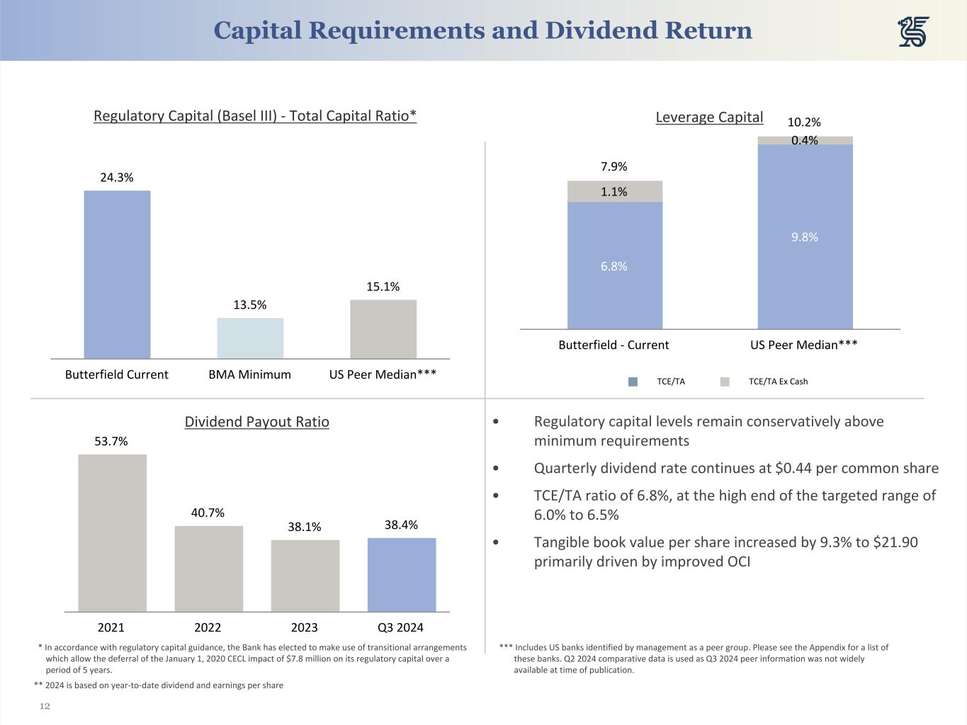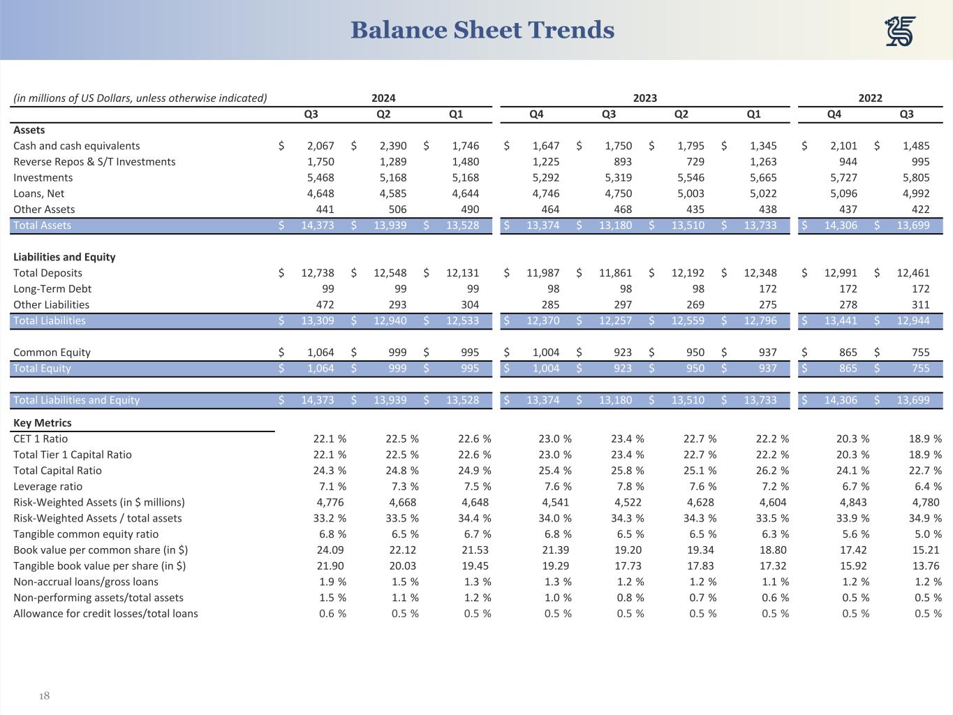 18 (in millions of US Dollars, unless otherwise indicated) 2024 2023 2022 Q3 Q2 Q1 Q4 Q3 Q2 Q1 Q4 Q3 Assets Cash and cash equivalents $ 2,067 $ 2,390 $ 1,746 $ 1,647 $ 1,750 $ 1,795 $ 1,345 $ 2,101 $ 1,485 Reverse Repos & S/T Investments 1,750 1,289 1,480 1,225 893 729 1,263 944 995 Investments 5,468 5,168 5,168 5,292 5,319 5,546 5,665 5,727 5,805 Loans, Net 4,648 4,585 4,644 4,746 4,750 5,003 5,022 5,096 4,992 Other Assets 441 506 490 464 468 435 438 437 422 Total Assets $ 14,373 $ 13,939 $ 13,528 $ 13,374 $ 13,180 $ 13,510 $ 13,733 $ 14,306 $ 13,699 Liabilities and Equity Total Deposits $ 12,738 $ 12,548 $ 12,131 $ 11,987 $ 11,861 $ 12,192 $ 12,348 $ 12,991 $ 12,461 Long-Term Debt 99 99 99 98 98 98 172 172 172 Other Liabilities 472 293 304 285 297 269 275 278 311 Total Liabilities $ 13,309 $ 12,940 $ 12,533 $ 12,370 $ 12,257 $ 12,559 $ 12,796 $ 13,441 $ 12,944 Common Equity $ 1,064 $ 999 $ 995 $ 1,004 $ 923 $ 950 $ 937 $ 865 $ 755 Total Equity $ 1,064 $ 999 $ 995 $ 1,004 $ 923 $ 950 $ 937 $ 865 $ 755 Total Liabilities and Equity $ 14,373 $ 13,939 $ 13,528 $ 13,374 $ 13,180 $ 13,510 $ 13,733 $ 14,306 $ 13,699 Key Metrics CET 1 Ratio 22.1 % 22.5 % 22.6 % 23.0 % 23.4 % 22.7 % 22.2 % 20.3 % 18.9 % Total Tier 1 Capital Ratio 22.1 % 22.5 % 22.6 % 23.0 % 23.4 % 22.7 % 22.2 % 20.3 % 18.9 % Total Capital Ratio 24.3 % 24.8 % 24.9 % 25.4 % 25.8 % 25.1 % 26.2 % 24.1 % 22.7 % Leverage ratio 7.1 % 7.3 % 7.5 % 7.6 % 7.8 % 7.6 % 7.2 % 6.7 % 6.4 % Risk-Weighted Assets (in $ millions) 4,776 4,668 4,648 4,541 4,522 4,628 4,604 4,843 4,780 Risk-Weighted Assets / total assets 33.2 % 33.5 % 34.4 % 34.0 % 34.3 % 34.3 % 33.5 % 33.9 % 34.9 % Tangible common equity ratio 6.8 % 6.5 % 6.7 % 6.8 % 6.5 % 6.5 % 6.3 % 5.6 % 5.0 % Book value per common share (in $) 24.09 22.12 21.53 21.39 19.20 19.34 18.80 17.42 15.21 Tangible book value per share (in $) 21.90 20.03 19.45 19.29 17.73 17.83 17.32 15.92 13.76 Non-accrual loans/gross loans 1.9 % 1.5 % 1.3 % 1.3 % 1.2 % 1.2 % 1.1 % 1.2 % 1.2 % Non-performing assets/total assets 1.5 % 1.1 % 1.2 % 1.0 % 0.8 % 0.7 % 0.6 % 0.5 % 0.5 % Allowance for credit losses/total loans 0.6 % 0.5 % 0.5 % 0.5 % 0.5 % 0.5 % 0.5 % 0.5 % 0.5 % Balance Sheet Trends