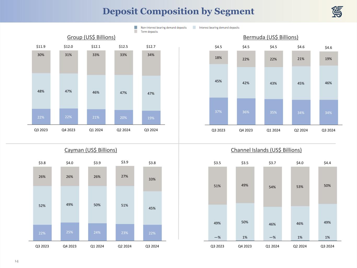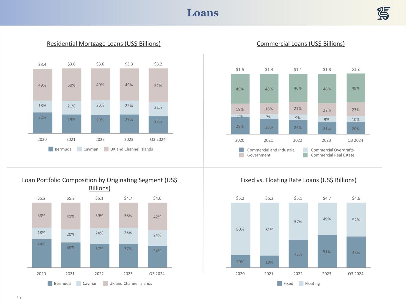 14 Group (US$ Billions) Bermuda (US$ Billions) Deposit Composition by Segment Cayman (US$ Billions) Channel Islands (US$ Billions) 22% 22% 21% 20% 19% 48% 47% 46% 47% 47% 30% 31% 33% 33% 34% $11.9 $12.0 $12.1 $12.5 $12.7 Q3 2023 Q4 2023 Q1 2024 Q2 2024 Q3 2024 22% 25% 24% 23% 22% 52% 49% 50% 51% 45% 26% 26% 26% 27% 33% $3.8 $4.0 $3.9 $3.9 $3.8 Q3 2023 Q4 2023 Q1 2024 Q2 2024 Q3 2024 37% 36% 35% 34% 34% 45% 42% 43% 45% 46% 18% 22% 22% 21% 19% $4.5 $4.5 $4.5 $4.6 $4.6 Q3 2023 Q4 2023 Q1 2024 Q2 2024 Q3 2024 —% 1% —% 1% 1% 49% 50% 46% 46% 49% 51% 49% 54% 53% 50% $3.5 $3.5 $3.7 $4.0 $4.4 Q3 2023 Q4 2023 Q1 2024 Q2 2024 Q3 2024