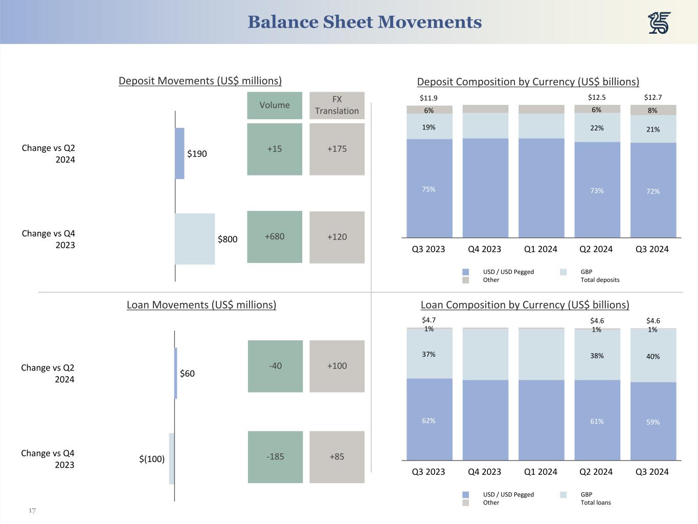 17 Balance Sheet Movements Deposit Composition by Currency (US$ billions)Deposit Movements (US$ millions) $190 $800 Change vs Q2 2024 Change vs Q4 2023 Loan Movements (US$ millions) Loan Composition by Currency (US$ billions) +15 +175 $60 $(100) Change vs Q2 2024 Change vs Q4 2023 Volume FX Translation 75% 73% 72% 19% 22% 21% 6% 6% 8% $11.9 $12.5 $12.7 USD / USD Pegged GBP Other Total deposits Q3 2023 Q4 2023 Q1 2024 Q2 2024 Q3 2024 62% 61% 59% 37% 38% 40% 1% 1% 1% $4.7 $4.6 $4.6 USD / USD Pegged GBP Other Total loans Q3 2023 Q4 2023 Q1 2024 Q2 2024 Q3 2024 -185 +85 +680 +120 -40 +100