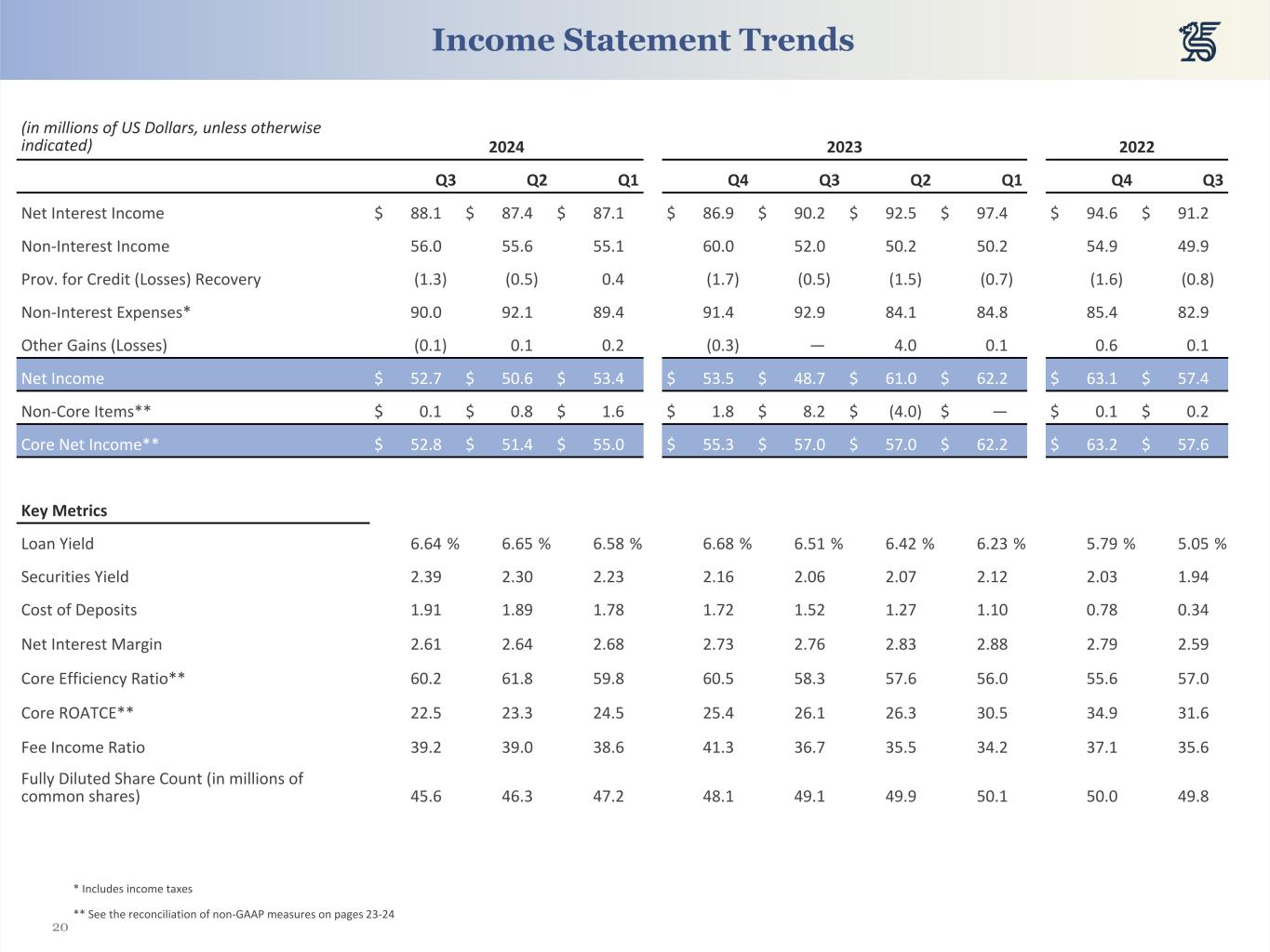 20 (in millions of US Dollars, unless otherwise indicated) 2024 2023 2022 Q3 Q2 Q1 Q4 Q3 Q2 Q1 Q4 Q3 Net Interest Income $ 88.1 $ 87.4 $ 87.1 $ 86.9 $ 90.2 $ 92.5 $ 97.4 $ 94.6 $ 91.2 Non-Interest Income 56.0 55.6 55.1 60.0 52.0 50.2 50.2 54.9 49.9 Prov. for Credit (Losses) Recovery (1.3) (0.5) 0.4 (1.7) (0.5) (1.5) (0.7) (1.6) (0.8) Non-Interest Expenses* 90.0 92.1 89.4 91.4 92.9 84.1 84.8 85.4 82.9 Other Gains (Losses) (0.1) 0.1 0.2 (0.3) — 4.0 0.1 0.6 0.1 Net Income $ 52.7 $ 50.6 $ 53.4 $ 53.5 $ 48.7 $ 61.0 $ 62.2 $ 63.1 $ 57.4 Non-Core Items** $ 0.1 $ 0.8 $ 1.6 $ 1.8 $ 8.2 $ (4.0) $ — $ 0.1 $ 0.2 Core Net Income** $ 52.8 $ 51.4 $ 55.0 $ 55.3 $ 57.0 $ 57.0 $ 62.2 $ 63.2 $ 57.6 Key Metrics Loan Yield 6.64 % 6.65 % 6.58 % 6.68 % 6.51 % 6.42 % 6.23 % 5.79 % 5.05 % Securities Yield 2.39 2.30 2.23 2.16 2.06 2.07 2.12 2.03 1.94 Cost of Deposits 1.91 1.89 1.78 1.72 1.52 1.27 1.10 0.78 0.34 Net Interest Margin 2.61 2.64 2.68 2.73 2.76 2.83 2.88 2.79 2.59 Core Efficiency Ratio** 60.2 61.8 59.8 60.5 58.3 57.6 56.0 55.6 57.0 Core ROATCE** 22.5 23.3 24.5 25.4 26.1 26.3 30.5 34.9 31.6 Fee Income Ratio 39.2 39.0 38.6 41.3 36.7 35.5 34.2 37.1 35.6 Fully Diluted Share Count (in millions of common shares) 45.6 46.3 47.2 48.1 49.1 49.9 50.1 50.0 49.8 * Includes income taxes ** See the reconciliation of non-GAAP measures on pages 23-24 Income Statement Trends