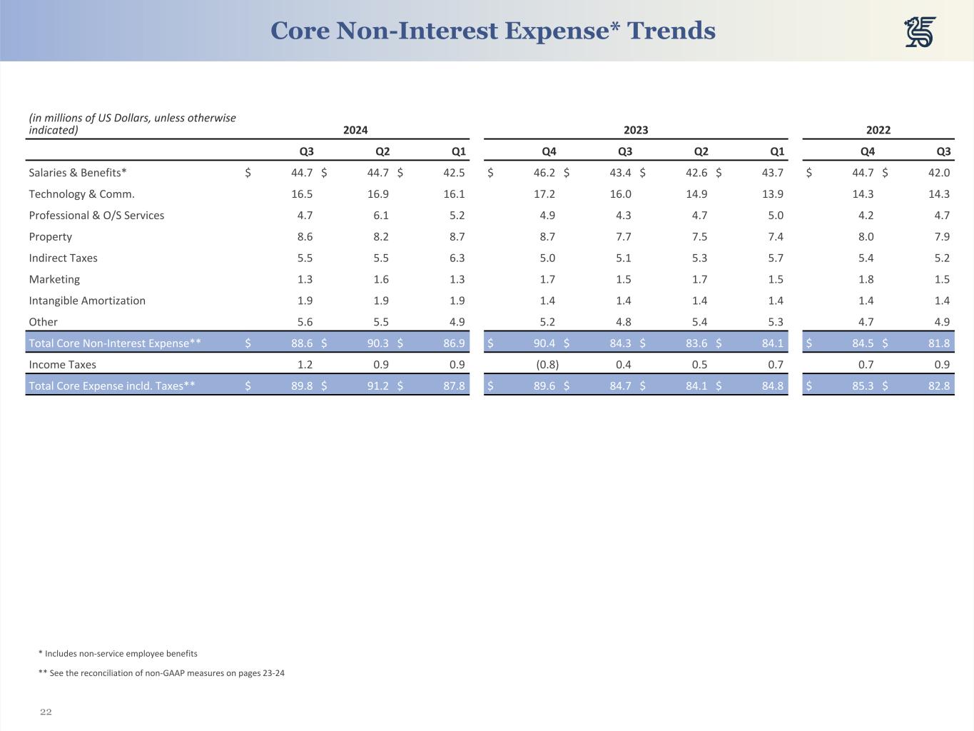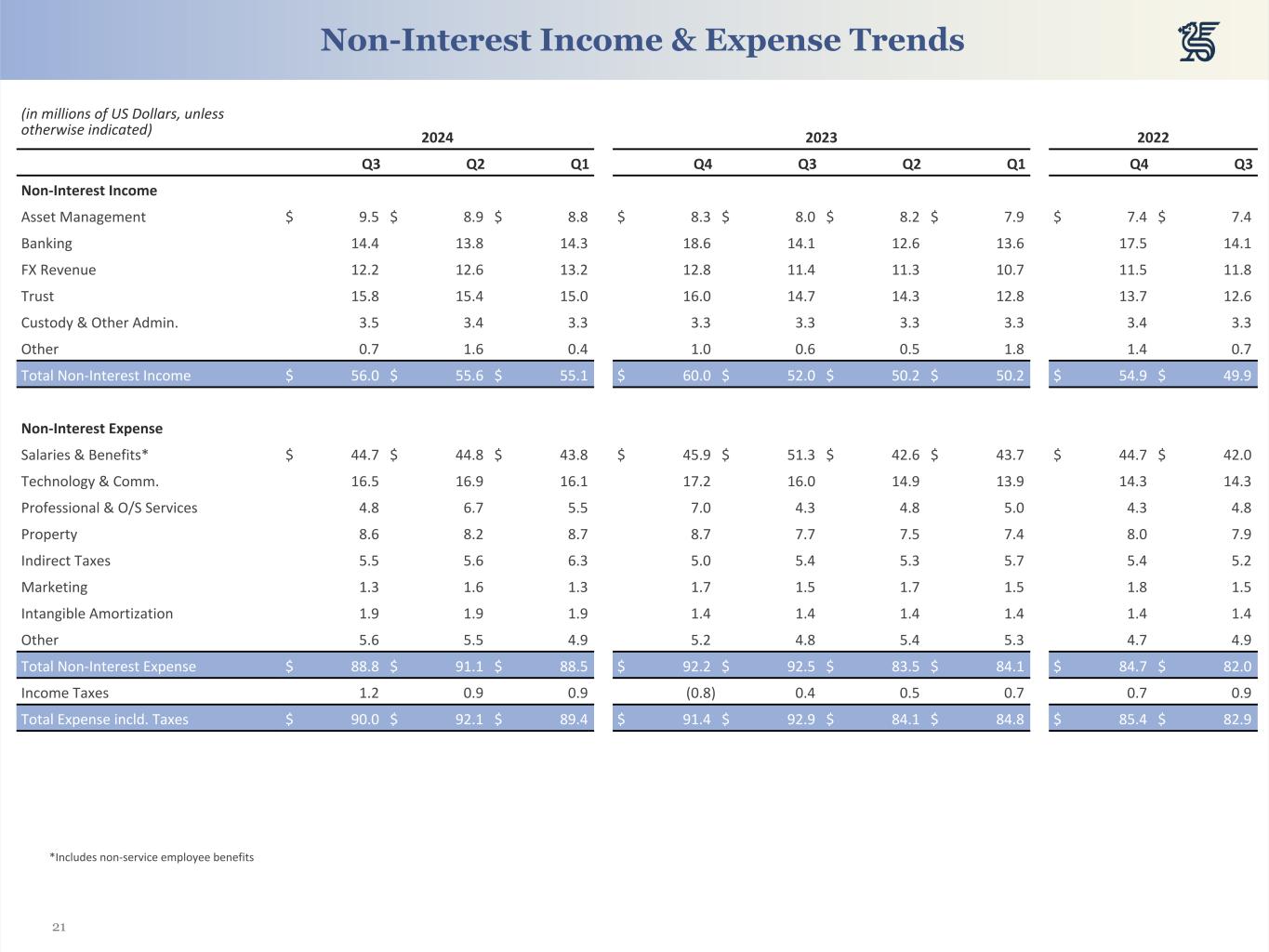 21 (in millions of US Dollars, unless otherwise indicated) 2024 2023 2022 Q3 Q2 Q1 Q4 Q3 Q2 Q1 Q4 Q3 Non-Interest Income Asset Management $ 9.5 $ 8.9 $ 8.8 $ 8.3 $ 8.0 $ 8.2 $ 7.9 $ 7.4 $ 7.4 Banking 14.4 13.8 14.3 18.6 14.1 12.6 13.6 17.5 14.1 FX Revenue 12.2 12.6 13.2 12.8 11.4 11.3 10.7 11.5 11.8 Trust 15.8 15.4 15.0 16.0 14.7 14.3 12.8 13.7 12.6 Custody & Other Admin. 3.5 3.4 3.3 3.3 3.3 3.3 3.3 3.4 3.3 Other 0.7 1.6 0.4 1.0 0.6 0.5 1.8 1.4 0.7 Total Non-Interest Income $ 56.0 $ 55.6 $ 55.1 $ 60.0 $ 52.0 $ 50.2 $ 50.2 $ 54.9 $ 49.9 Non-Interest Expense Salaries & Benefits* $ 44.7 $ 44.8 $ 43.8 $ 45.9 $ 51.3 $ 42.6 $ 43.7 $ 44.7 $ 42.0 Technology & Comm. 16.5 16.9 16.1 17.2 16.0 14.9 13.9 14.3 14.3 Professional & O/S Services 4.8 6.7 5.5 7.0 4.3 4.8 5.0 4.3 4.8 Property 8.6 8.2 8.7 8.7 7.7 7.5 7.4 8.0 7.9 Indirect Taxes 5.5 5.6 6.3 5.0 5.4 5.3 5.7 5.4 5.2 Marketing 1.3 1.6 1.3 1.7 1.5 1.7 1.5 1.8 1.5 Intangible Amortization 1.9 1.9 1.9 1.4 1.4 1.4 1.4 1.4 1.4 Other 5.6 5.5 4.9 5.2 4.8 5.4 5.3 4.7 4.9 Total Non-Interest Expense $ 88.8 $ 91.1 $ 88.5 $ 92.2 $ 92.5 $ 83.5 $ 84.1 $ 84.7 $ 82.0 Income Taxes 1.2 0.9 0.9 (0.8) 0.4 0.5 0.7 0.7 0.9 Total Expense incld. Taxes $ 90.0 $ 92.1 $ 89.4 $ 91.4 $ 92.9 $ 84.1 $ 84.8 $ 85.4 $ 82.9 *Includes non-service employee benefits Non-Interest Income & Expense Trends
