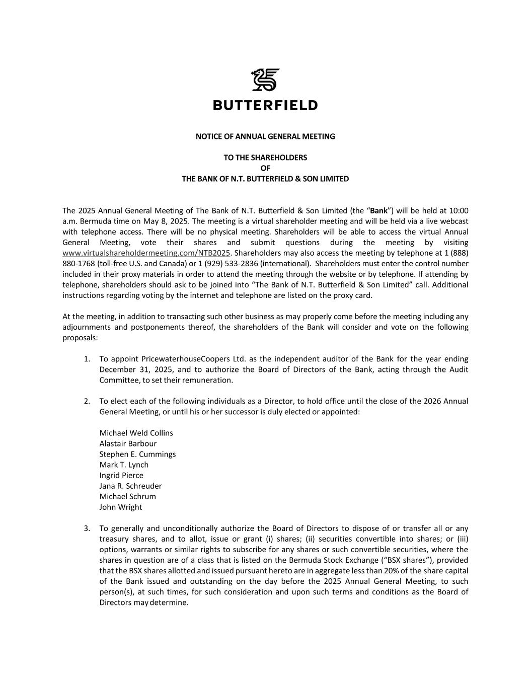 NOTICE OF ANNUAL GENERAL MEETING TO THE SHAREHOLDERS OF THE BANK OF N.T. BUTTERFIELD & SON LIMITED The 2025 Annual General Meeting of The Bank of N.T. Butterfield & Son Limited (the “Bank”) will be held at 10:00 a.m. Bermuda time on May 8, 2025. The meeting is a virtual shareholder meeting and will be held via a live webcast with telephone access. There will be no physical meeting. Shareholders will be able to access the virtual Annual General Meeting, vote their shares and submit questions during the meeting by visiting www.virtualshareholdermeeting.com/NTB2025. Shareholders may also access the meeting by telephone at 1 (888) 880-1768 (toll-free U.S. and Canada) or 1 (929) 533-2836 (international). Shareholders must enter the control number included in their proxy materials in order to attend the meeting through the website or by telephone. If attending by telephone, shareholders should ask to be joined into “The Bank of N.T. Butterfield & Son Limited” call. Additional instructions regarding voting by the internet and telephone are listed on the proxy card. At the meeting, in addition to transacting such other business as may properly come before the meeting including any adjournments and postponements thereof, the shareholders of the Bank will consider and vote on the following proposals: 1. To appoint PricewaterhouseCoopers Ltd. as the independent auditor of the Bank for the year ending December 31, 2025, and to authorize the Board of Directors of the Bank, acting through the Audit Committee, to set their remuneration. 2. To elect each of the following individuals as a Director, to hold office until the close of the 2026 Annual General Meeting, or until his or her successor is duly elected or appointed: Michael Weld Collins Alastair Barbour Stephen E. Cummings Mark T. Lynch Ingrid Pierce Jana R. Schreuder Michael Schrum John Wright 3. To generally and unconditionally authorize the Board of Directors to dispose of or transfer all or any treasury shares, and to allot, issue or grant (i) shares; (ii) securities convertible into shares; or (iii) options, warrants or similar rights to subscribe for any shares or such convertible securities, where the shares in question are of a class that is listed on the Bermuda Stock Exchange (“BSX shares”), provided that the BSX shares allotted and issued pursuant hereto are in aggregate less than 20% of the share capital of the Bank issued and outstanding on the day before the 2025 Annual General Meeting, to such person(s), at such times, for such consideration and upon such terms and conditions as the Board of Directors may determine.