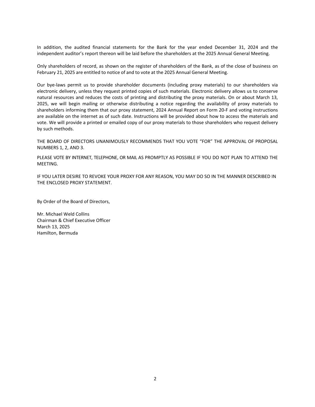 2 In addition, the audited financial statements for the Bank for the year ended December 31, 2024 and the independent auditor’s report thereon will be laid before the shareholders at the 2025 Annual General Meeting. Only shareholders of record, as shown on the register of shareholders of the Bank, as of the close of business on February 21, 2025 are entitled to notice of and to vote at the 2025 Annual General Meeting. Our bye-laws permit us to provide shareholder documents (including proxy materials) to our shareholders via electronic delivery, unless they request printed copies of such materials. Electronic delivery allows us to conserve natural resources and reduces the costs of printing and distributing the proxy materials. On or about March 13, 2025, we will begin mailing or otherwise distributing a notice regarding the availability of proxy materials to shareholders informing them that our proxy statement, 2024 Annual Report on Form 20-F and voting instructions are available on the internet as of such date. Instructions will be provided about how to access the materials and vote. We will provide a printed or emailed copy of our proxy materials to those shareholders who request delivery by such methods. THE BOARD OF DIRECTORS UNANIMOUSLY RECOMMENDS THAT YOU VOTE “FOR” THE APPROVAL OF PROPOSAL NUMBERS 1, 2, AND 3. PLEASE VOTE BY INTERNET, TELEPHONE, OR MAIL AS PROMPTLY AS POSSIBLE IF YOU DO NOT PLAN TO ATTEND THE MEETING. IF YOU LATER DESIRE TO REVOKE YOUR PROXY FOR ANY REASON, YOU MAY DO SO IN THE MANNER DESCRIBED IN THE ENCLOSED PROXY STATEMENT. By Order of the Board of Directors, Mr. Michael Weld Collins Chairman & Chief Executive Officer March 13, 2025 Hamilton, Bermuda
