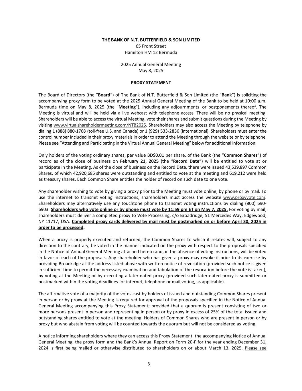 3 THE BANK OF N.T. BUTTERFIELD & SON LIMITED 65 Front Street Hamilton HM 12 Bermuda 2025 Annual General Meeting May 8, 2025 PROXY STATEMENT The Board of Directors (the “Board”) of The Bank of N.T. Butterfield & Son Limited (the “Bank”) is soliciting the accompanying proxy form to be voted at the 2025 Annual General Meeting of the Bank to be held at 10:00 a.m. Bermuda time on May 8, 2025 (the “Meeting”), including any adjournments or postponements thereof. The Meeting is virtual and will be held via a live webcast with telephone access. There will be no physical meeting. Shareholders will be able to access the virtual Meeting, vote their shares and submit questions during the Meeting by visiting www.virtualshareholdermeeting.com/NTB2025. Shareholders may also access the Meeting by telephone by dialing 1 (888) 880-1768 (toll-free U.S. and Canada) or 1 (929) 533-2836 (international). Shareholders must enter the control number included in their proxy materials in order to attend the Meeting through the website or by telephone. Please see “Attending and Participating in the Virtual Annual General Meeting” below for additional information. Only holders of the voting ordinary shares, par value BD$0.01 per share, of the Bank (the “Common Shares”) of record as of the close of business on February 21, 2025 (the “Record Date”) will be entitled to vote at or participate in the Meeting. As of the close of business on the Record Date, there were issued 43,539,897 Common Shares, of which 42,920,685 shares were outstanding and entitled to vote at the meeting and 619,212 were held as treasury shares. Each Common Share entitles the holder of record on such date to one vote. Any shareholder wishing to vote by giving a proxy prior to the Meeting must vote online, by phone or by mail. To use the internet to transmit voting instructions, shareholders must access the website www.proxyvote.com. Shareholders may alternatively use any touchtone phone to transmit voting instructions by dialing (800) 690- 6903. Shareholders who vote online or by phone must vote by 11:59 pm ET on May 7, 2025. For voting by mail, shareholders must deliver a completed proxy to Vote Processing, c/o Broadridge, 51 Mercedes Way, Edgewood, NY 11717, USA. Completed proxy cards delivered by mail must be postmarked on or before April 30, 2025 in order to be processed. When a proxy is properly executed and returned, the Common Shares to which it relates will, subject to any direction to the contrary, be voted in the manner indicated on the proxy with respect to the proposals specified in the Notice of Annual General Meeting attached hereto and, in the absence of voting instructions, will be voted in favor of each of the proposals. Any shareholder who has given a proxy may revoke it prior to its exercise by providing Broadridge at the address listed above with written notice of revocation (provided such notice is given in sufficient time to permit the necessary examination and tabulation of the revocation before the vote is taken), by voting at the Meeting or by executing a later-dated proxy (provided such later-dated proxy is submitted or postmarked within the voting deadlines for internet, telephone or mail voting, as applicable). The affirmative vote of a majority of the votes cast by holders of issued and outstanding Common Shares present in person or by proxy at the Meeting is required for approval of the proposals specified in the Notice of Annual General Meeting accompanying this Proxy Statement; provided that a quorum is present consisting of two or more persons present in person and representing in person or by proxy in excess of 25% of the total issued and outstanding shares entitled to vote at the meeting. Holders of Common Shares who are present in person or by proxy but who abstain from voting will be counted towards the quorum but will not be considered as voting. A notice informing shareholders where they can access this Proxy Statement, the accompanying Notice of Annual General Meeting, the proxy form and the Bank’s Annual Report on Form 20-F for the year ending December 31, 2024 is first being mailed or otherwise distributed to shareholders on or about March 13, 2025. Please see