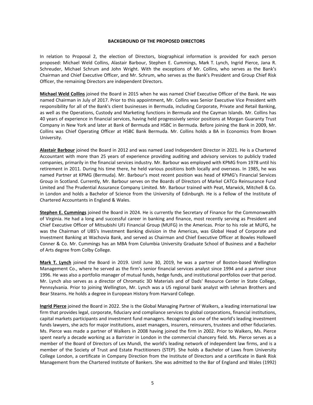5 BACKGROUND OF THE PROPOSED DIRECTORS In relation to Proposal 2, the election of Directors, biographical information is provided for each person proposed: Michael Weld Collins, Alastair Barbour, Stephen E. Cummings, Mark T. Lynch, Ingrid Pierce, Jana R. Schreuder, Michael Schrum and John Wright. With the exceptions of Mr. Collins, who serves as the Bank’s Chairman and Chief Executive Officer, and Mr. Schrum, who serves as the Bank’s President and Group Chief Risk Officer, the remaining Directors are independent Directors. Michael Weld Collins joined the Board in 2015 when he was named Chief Executive Officer of the Bank. He was named Chairman in July of 2017. Prior to this appointment, Mr. Collins was Senior Executive Vice President with responsibility for all of the Bank's client businesses in Bermuda, including Corporate, Private and Retail Banking, as well as the Operations, Custody and Marketing functions in Bermuda and the Cayman Islands. Mr. Collins has 40 years of experience in financial services, having held progressively senior positions at Morgan Guaranty Trust Company in New York and later at Bank of Bermuda and HSBC in Bermuda. Before joining the Bank in 2009, Mr. Collins was Chief Operating Officer at HSBC Bank Bermuda. Mr. Collins holds a BA in Economics from Brown University. Alastair Barbour joined the Board in 2012 and was named Lead Independent Director in 2021. He is a Chartered Accountant with more than 25 years of experience providing auditing and advisory services to publicly traded companies, primarily in the financial services industry. Mr. Barbour was employed with KPMG from 1978 until his retirement in 2011. During his time there, he held various positions both locally and overseas. In 1985, he was named Partner at KPMG (Bermuda). Mr. Barbour's most recent position was head of KPMG's Financial Services Group in Scotland. Currently, Mr. Barbour serves on the Boards of Directors of Markel CATCo Reinsurance Fund Limited and The Prudential Assurance Company Limited. Mr. Barbour trained with Peat, Marwick, Mitchell & Co. in London and holds a Bachelor of Science from the University of Edinburgh. He is a Fellow of the Institute of Chartered Accountants in England & Wales. Stephen E. Cummings joined the Board in 2024. He is currently the Secretary of Finance for the Commonwealth of Virginia. He had a long and successful career in banking and finance, most recently serving as President and Chief Executive Officer of Mitsubishi UFJ Financial Group (MUFG) in the Americas. Prior to his role at MUFG, he was the Chairman of UBS’s Investment Banking division in the Americas, was Global Head of Corporate and Investment Banking at Wachovia Bank, and served as Chairman and Chief Executive Officer at Bowles Hollowell Conner & Co. Mr. Cummings has an MBA from Columbia University Graduate School of Business and a Bachelor of Arts degree from Colby College. Mark T. Lynch joined the Board in 2019. Until June 30, 2019, he was a partner of Boston-based Wellington Management Co., where he served as the firm’s senior financial services analyst since 1994 and a partner since 1996. He was also a portfolio manager of mutual funds, hedge funds, and institutional portfolios over that period. Mr. Lynch also serves as a director of Chromatic 3D Materials and of Dads' Resource Center in State College, Pennsylvania. Prior to joining Wellington, Mr. Lynch was a US regional bank analyst with Lehman Brothers and Bear Stearns. He holds a degree in European History from Harvard College. Ingrid Pierce joined the Board in 2022. She is the Global Managing Partner of Walkers, a leading international law firm that provides legal, corporate, fiduciary and compliance services to global corporations, financial institutions, capital markets participants and investment fund managers. Recognized as one of the world's leading investment funds lawyers, she acts for major institutions, asset managers, insurers, reinsurers, trustees and other fiduciaries. Ms. Pierce was made a partner of Walkers in 2008 having joined the firm in 2002. Prior to Walkers, Ms. Pierce spent nearly a decade working as a Barrister in London in the commercial chancery field. Ms. Pierce serves as a member of the Board of Directors of Lex Mundi, the world's leading network of independent law firms, and is a member of the Society of Trust and Estate Practitioners (STEP). She holds a Bachelor of Laws from University College London, a certificate in Company Direction from the Institute of Directors and a certificate in Bank Risk Management from the Chartered Institute of Bankers. She was admitted to the Bar of England and Wales (1992)