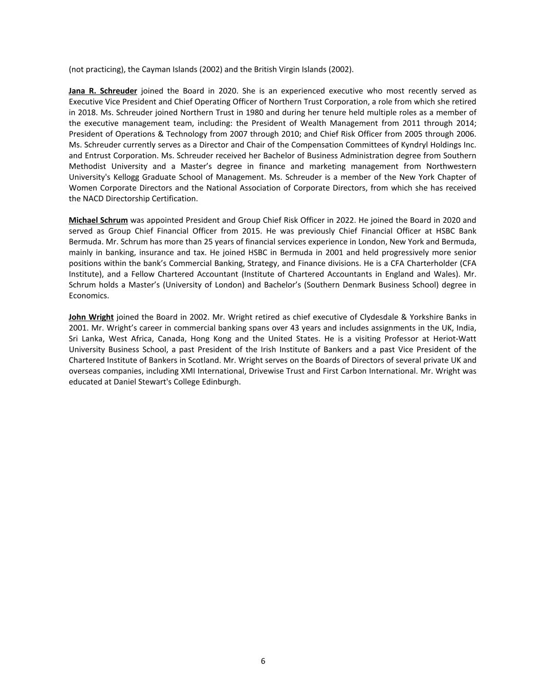 6 (not practicing), the Cayman Islands (2002) and the British Virgin Islands (2002). Jana R. Schreuder joined the Board in 2020. She is an experienced executive who most recently served as Executive Vice President and Chief Operating Officer of Northern Trust Corporation, a role from which she retired in 2018. Ms. Schreuder joined Northern Trust in 1980 and during her tenure held multiple roles as a member of the executive management team, including: the President of Wealth Management from 2011 through 2014; President of Operations & Technology from 2007 through 2010; and Chief Risk Officer from 2005 through 2006. Ms. Schreuder currently serves as a Director and Chair of the Compensation Committees of Kyndryl Holdings Inc. and Entrust Corporation. Ms. Schreuder received her Bachelor of Business Administration degree from Southern Methodist University and a Master’s degree in finance and marketing management from Northwestern University's Kellogg Graduate School of Management. Ms. Schreuder is a member of the New York Chapter of Women Corporate Directors and the National Association of Corporate Directors, from which she has received the NACD Directorship Certification. Michael Schrum was appointed President and Group Chief Risk Officer in 2022. He joined the Board in 2020 and served as Group Chief Financial Officer from 2015. He was previously Chief Financial Officer at HSBC Bank Bermuda. Mr. Schrum has more than 25 years of financial services experience in London, New York and Bermuda, mainly in banking, insurance and tax. He joined HSBC in Bermuda in 2001 and held progressively more senior positions within the bank’s Commercial Banking, Strategy, and Finance divisions. He is a CFA Charterholder (CFA Institute), and a Fellow Chartered Accountant (Institute of Chartered Accountants in England and Wales). Mr. Schrum holds a Master’s (University of London) and Bachelor’s (Southern Denmark Business School) degree in Economics. John Wright joined the Board in 2002. Mr. Wright retired as chief executive of Clydesdale & Yorkshire Banks in 2001. Mr. Wright’s career in commercial banking spans over 43 years and includes assignments in the UK, India, Sri Lanka, West Africa, Canada, Hong Kong and the United States. He is a visiting Professor at Heriot-Watt University Business School, a past President of the Irish Institute of Bankers and a past Vice President of the Chartered Institute of Bankers in Scotland. Mr. Wright serves on the Boards of Directors of several private UK and overseas companies, including XMI International, Drivewise Trust and First Carbon International. Mr. Wright was educated at Daniel Stewart's College Edinburgh.