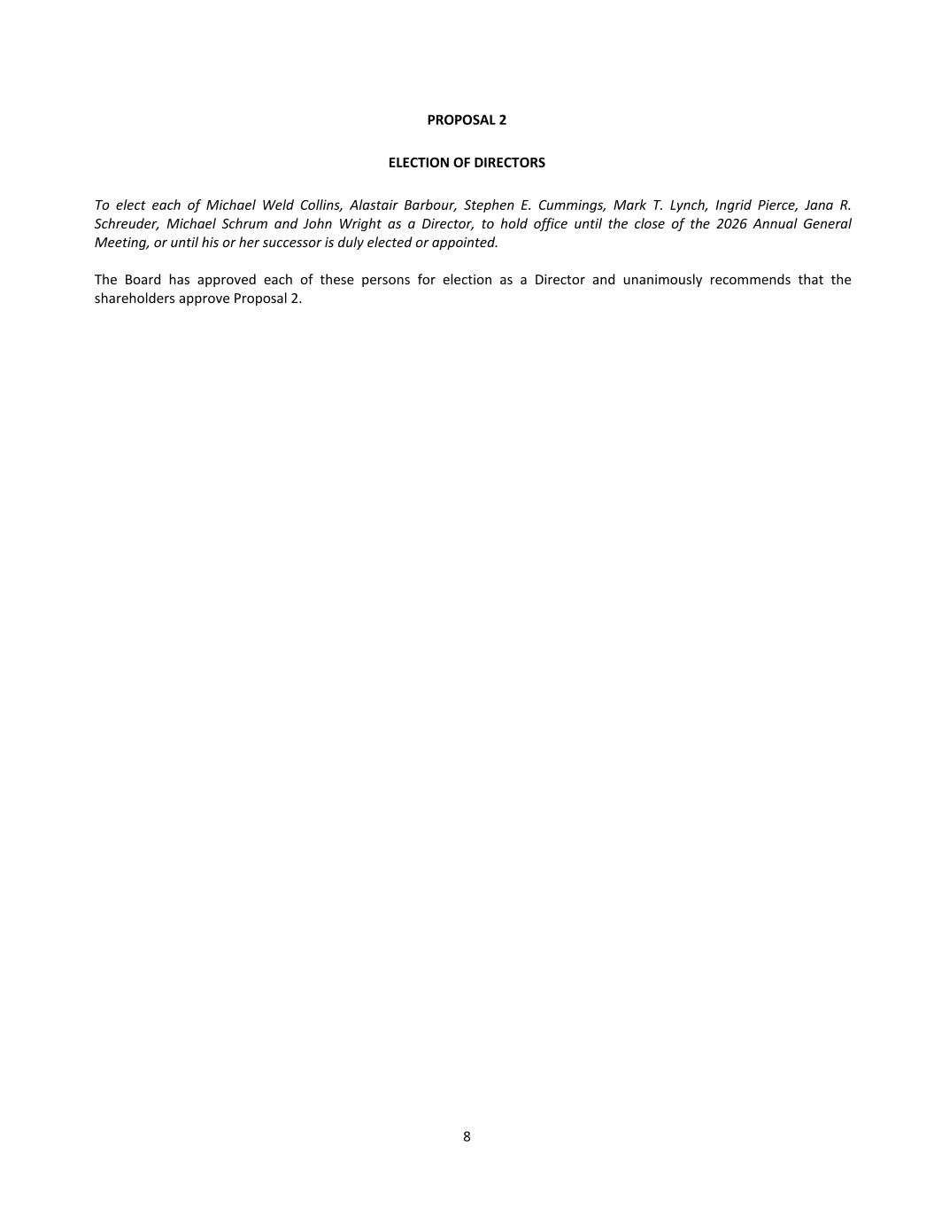 8 PROPOSAL 2 ELECTION OF DIRECTORS To elect each of Michael Weld Collins, Alastair Barbour, Stephen E. Cummings, Mark T. Lynch, Ingrid Pierce, Jana R. Schreuder, Michael Schrum and John Wright as a Director, to hold office until the close of the 2026 Annual General Meeting, or until his or her successor is duly elected or appointed. The Board has approved each of these persons for election as a Director and unanimously recommends that the shareholders approve Proposal 2.