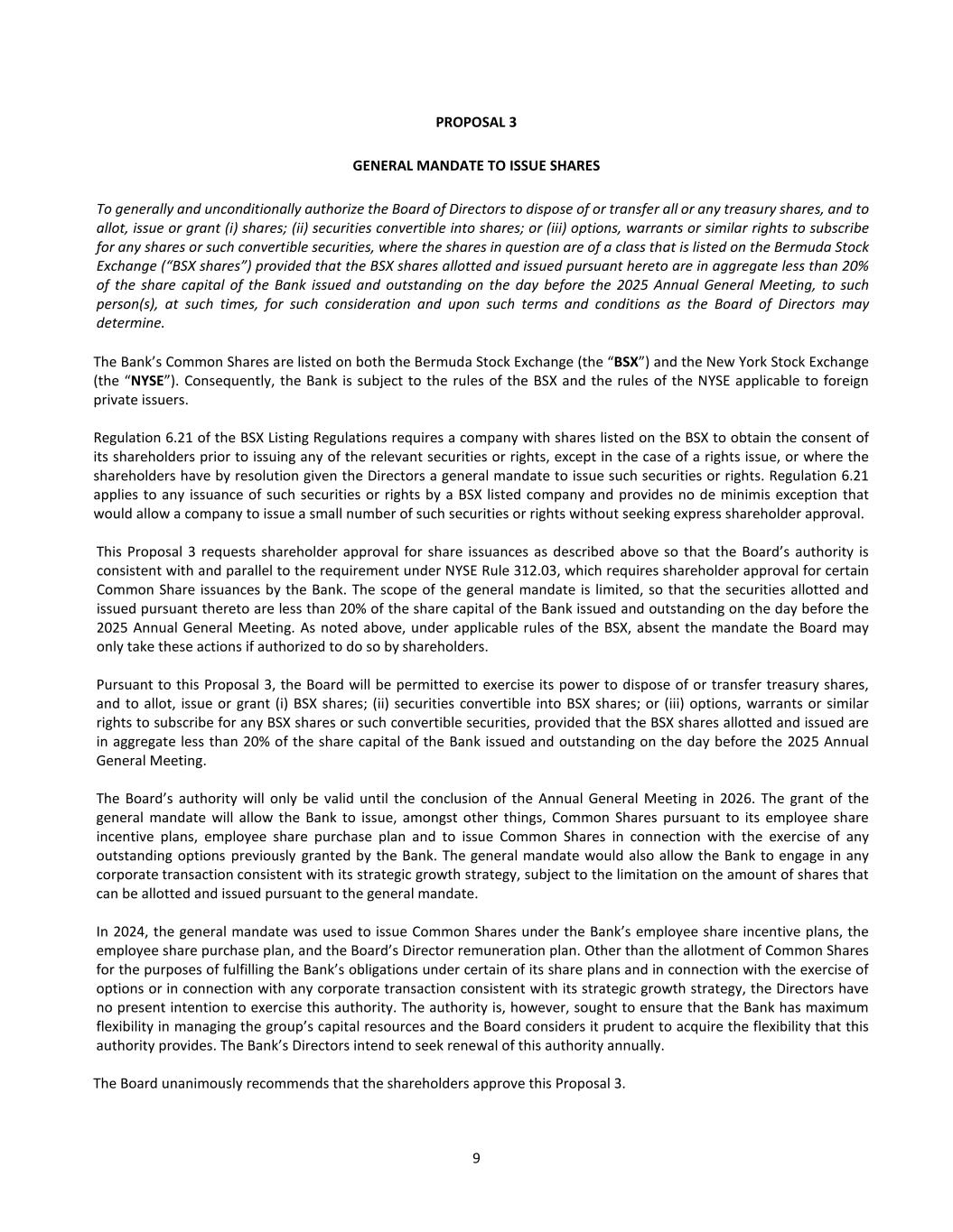 9 PROPOSAL 3 GENERAL MANDATE TO ISSUE SHARES To generally and unconditionally authorize the Board of Directors to dispose of or transfer all or any treasury shares, and to allot, issue or grant (i) shares; (ii) securities convertible into shares; or (iii) options, warrants or similar rights to subscribe for any shares or such convertible securities, where the shares in question are of a class that is listed on the Bermuda Stock Exchange (“BSX shares”) provided that the BSX shares allotted and issued pursuant hereto are in aggregate less than 20% of the share capital of the Bank issued and outstanding on the day before the 2025 Annual General Meeting, to such person(s), at such times, for such consideration and upon such terms and conditions as the Board of Directors may determine. The Bank’s Common Shares are listed on both the Bermuda Stock Exchange (the “BSX”) and the New York Stock Exchange (the “NYSE”). Consequently, the Bank is subject to the rules of the BSX and the rules of the NYSE applicable to foreign private issuers. Regulation 6.21 of the BSX Listing Regulations requires a company with shares listed on the BSX to obtain the consent of its shareholders prior to issuing any of the relevant securities or rights, except in the case of a rights issue, or where the shareholders have by resolution given the Directors a general mandate to issue such securities or rights. Regulation 6.21 applies to any issuance of such securities or rights by a BSX listed company and provides no de minimis exception that would allow a company to issue a small number of such securities or rights without seeking express shareholder approval. This Proposal 3 requests shareholder approval for share issuances as described above so that the Board’s authority is consistent with and parallel to the requirement under NYSE Rule 312.03, which requires shareholder approval for certain Common Share issuances by the Bank. The scope of the general mandate is limited, so that the securities allotted and issued pursuant thereto are less than 20% of the share capital of the Bank issued and outstanding on the day before the 2025 Annual General Meeting. As noted above, under applicable rules of the BSX, absent the mandate the Board may only take these actions if authorized to do so by shareholders. Pursuant to this Proposal 3, the Board will be permitted to exercise its power to dispose of or transfer treasury shares, and to allot, issue or grant (i) BSX shares; (ii) securities convertible into BSX shares; or (iii) options, warrants or similar rights to subscribe for any BSX shares or such convertible securities, provided that the BSX shares allotted and issued are in aggregate less than 20% of the share capital of the Bank issued and outstanding on the day before the 2025 Annual General Meeting. The Board’s authority will only be valid until the conclusion of the Annual General Meeting in 2026. The grant of the general mandate will allow the Bank to issue, amongst other things, Common Shares pursuant to its employee share incentive plans, employee share purchase plan and to issue Common Shares in connection with the exercise of any outstanding options previously granted by the Bank. The general mandate would also allow the Bank to engage in any corporate transaction consistent with its strategic growth strategy, subject to the limitation on the amount of shares that can be allotted and issued pursuant to the general mandate. In 2024, the general mandate was used to issue Common Shares under the Bank’s employee share incentive plans, the employee share purchase plan, and the Board’s Director remuneration plan. Other than the allotment of Common Shares for the purposes of fulfilling the Bank’s obligations under certain of its share plans and in connection with the exercise of options or in connection with any corporate transaction consistent with its strategic growth strategy, the Directors have no present intention to exercise this authority. The authority is, however, sought to ensure that the Bank has maximum flexibility in managing the group’s capital resources and the Board considers it prudent to acquire the flexibility that this authority provides. The Bank’s Directors intend to seek renewal of this authority annually. The Board unanimously recommends that the shareholders approve this Proposal 3.