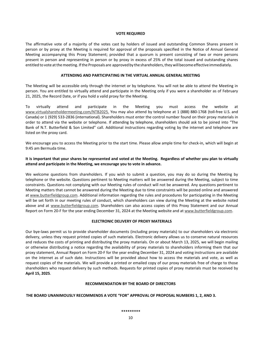 10 VOTE REQUIRED The affirmative vote of a majority of the votes cast by holders of issued and outstanding Common Shares present in person or by proxy at the Meeting is required for approval of the proposals specified in the Notice of Annual General Meeting accompanying this Proxy Statement; provided that a quorum is present consisting of two or more persons present in person and representing in person or by proxy in excess of 25% of the total issued and outstanding shares entitled to vote at the meeting. If the Proposals are approved by the shareholders, they will become effective immediately. ATTENDING AND PARTICIPATING IN THE VIRTUAL ANNUAL GENERAL MEETING The Meeting will be accessible only through the internet or by telephone. You will not be able to attend the Meeting in person. You are entitled to virtually attend and participate in the Meeting only if you were a shareholder as of February 21, 2025, the Record Date, or if you hold a valid proxy for the Meeting. To virtually attend and participate in the Meeting you must access the website at www.virtualshareholdermeeting.com/NTB2025. You may also attend by telephone at 1 (888) 880-1768 (toll-free U.S. and Canada) or 1 (929) 533-2836 (international). Shareholders must enter the control number found on their proxy materials in order to attend via the website or telephone. If attending by telephone, shareholders should ask to be joined into “The Bank of N.T. Butterfield & Son Limited” call. Additional instructions regarding voting by the internet and telephone are listed on the proxy card. We encourage you to access the Meeting prior to the start time. Please allow ample time for check-in, which will begin at 9:45 am Bermuda time. It is important that your shares be represented and voted at the Meeting. Regardless of whether you plan to virtually attend and participate in the Meeting, we encourage you to vote in advance. We welcome questions from shareholders. If you wish to submit a question, you may do so during the Meeting by telephone or the website. Questions pertinent to Meeting matters will be answered during the Meeting, subject to time constraints. Questions not complying with our Meeting rules of conduct will not be answered. Any questions pertinent to Meeting matters that cannot be answered during the Meeting due to time constraints will be posted online and answered at www.butterfieldgroup.com. Additional information regarding the rules and procedures for participating in the Meeting will be set forth in our meeting rules of conduct, which shareholders can view during the Meeting at the website noted above and at www.butterfieldgroup.com. Shareholders can also access copies of this Proxy Statement and our Annual Report on Form 20-F for the year ending December 31, 2024 at the Meeting website and at www.butterfieldgroup.com. ELECTRONIC DELIVERY OF PROXY MATERIALS Our bye-laws permit us to provide shareholder documents (including proxy materials) to our shareholders via electronic delivery, unless they request printed copies of such materials. Electronic delivery allows us to conserve natural resources and reduces the costs of printing and distributing the proxy materials. On or about March 13, 2025, we will begin mailing or otherwise distributing a notice regarding the availability of proxy materials to shareholders informing them that our proxy statement, Annual Report on Form 20-F for the year ending December 31, 2024 and voting instructions are available on the internet as of such date. Instructions will be provided about how to access the materials and vote, as well as request copies of the materials. We will provide a printed or emailed copy of our proxy materials free of charge to those shareholders who request delivery by such methods. Requests for printed copies of proxy materials must be received by April 15, 2025. RECOMMENDATION BY THE BOARD OF DIRECTORS THE BOARD UNANIMOUSLY RECOMMENDS A VOTE “FOR” APPROVAL OF PROPOSAL NUMBERS 1, 2, AND 3. *********