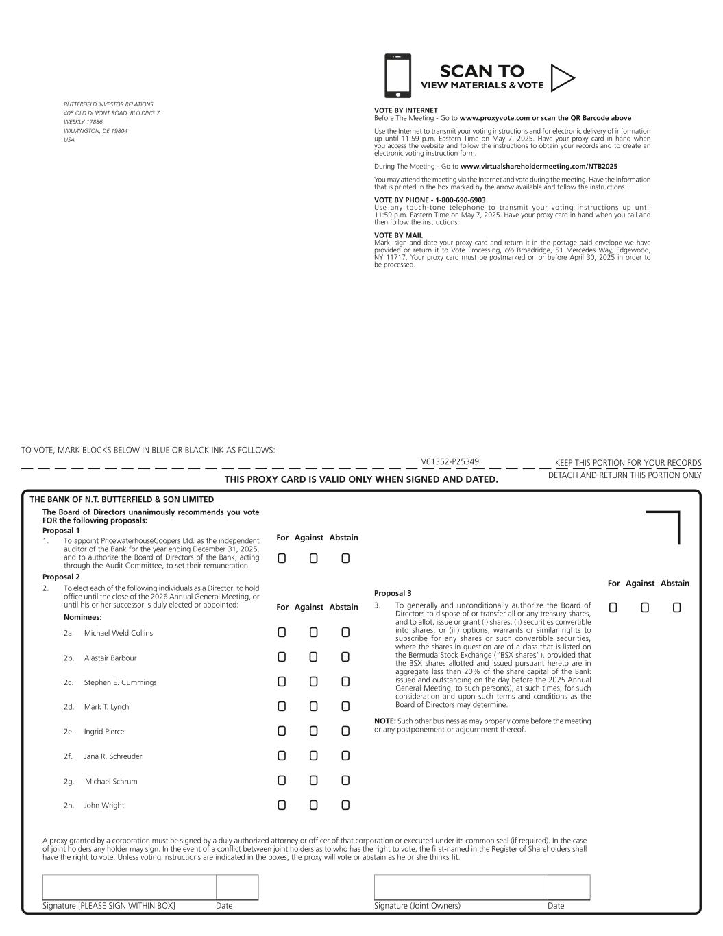 Signature [PLEASE SIGN WITHIN BOX] Date Signature (Joint Owners) Date TO VOTE, MARK BLOCKS BELOW IN BLUE OR BLACK INK AS FOLLOWS: KEEP THIS PORTION FOR YOUR RECORDS DETACH AND RETURN THIS PORTION ONLYTHIS PROXY CARD IS VALID ONLY WHEN SIGNED AND DATED. V61352-P25349 ! !! ! !! ! !! ! !! ! !! ! !! ! !! ! !! ! !! ! !! BUTTERFIELD INVESTOR RELATIONS 405 OLD DUPONT ROAD, BUILDING 7 WEEKLY 17886 WILMINGTON, DE 19804 USA THE BANK OF N.T. BUTTERFIELD & SON LIMITED 2g. Michael Schrum 1. To appoint PricewaterhouseCoopers Ltd. as the independent auditor of the Bank for the year ending December 31, 2025, and to authorize the Board of Directors of the Bank, acting through the Audit Committee, to set their remuneration. 2a. Michael Weld Collins 2b. Alastair Barbour 2e. Ingrid Pierce 2c. Stephen E. Cummings 2d. Mark T. Lynch 2f. Jana R. Schreuder 2. To elect each of the following individuals as a Director, to hold office until the close of the 2026 Annual General Meeting, or until his or her successor is duly elected or appointed: Nominees: The Board of Directors unanimously recommends you vote FOR the following proposals: 3. To generally and unconditionally authorize the Board of Directors to dispose of or transfer all or any treasury shares, and to allot, issue or grant (i) shares; (ii) securities convertible into shares; or (iii) options, warrants or similar rights to subscribe for any shares or such convertible securities, where the shares in question are of a class that is listed on the Bermuda Stock Exchange (“BSX shares”), provided that the BSX shares allotted and issued pursuant hereto are in aggregate less than 20% of the share capital of the Bank issued and outstanding on the day before the 2025 Annual General Meeting, to such person(s), at such times, for such consideration and upon such terms and conditions as the Board of Directors may determine. 2h. John Wright Proposal 3 NOTE: Such other business as may properly come before the meeting or any postponement or adjournment thereof. A proxy granted by a corporation must be signed by a duly authorized attorney or officer of that corporation or executed under its common seal (if required). In the case of joint holders any holder may sign. In the event of a conflict between joint holders as to who has the right to vote, the first-named in the Register of Shareholders shall have the right to vote. Unless voting instructions are indicated in the boxes, the proxy will vote or abstain as he or she thinks fit. Proposal 1 Proposal 2 For Against Abstain For Against Abstain For Against Abstain VOTE BY INTERNET Before The Meeting - Go to www.proxyvote.com or scan the QR Barcode above Use the Internet to transmit your voting instructions and for electronic delivery of information up until 11:59 p.m. Eastern Time on May 7, 2025. Have your proxy card in hand when you access the website and follow the instructions to obtain your records and to create an electronic voting instruction form. During The Meeting - Go to www.virtualshareholdermeeting.com/NTB2025 You may attend the meeting via the Internet and vote during the meeting. Have the information that is printed in the box marked by the arrow available and follow the instructions. VOTE BY PHONE - 1-800-690-6903 Use any touch-tone telephone to transmit your voting instructions up until 11:59 p.m. Eastern Time on May 7, 2025. Have your proxy card in hand when you call and then follow the instructions. VOTE BY MAIL Mark, sign and date your proxy card and return it in the postage-paid envelope we have provided or return it to Vote Processing, c/o Broadridge, 51 Mercedes Way, Edgewood, NY 11717. Your proxy card must be postmarked on or before April 30, 2025 in order to be processed. SCAN TO VIEW MATERIALS & VOTEw