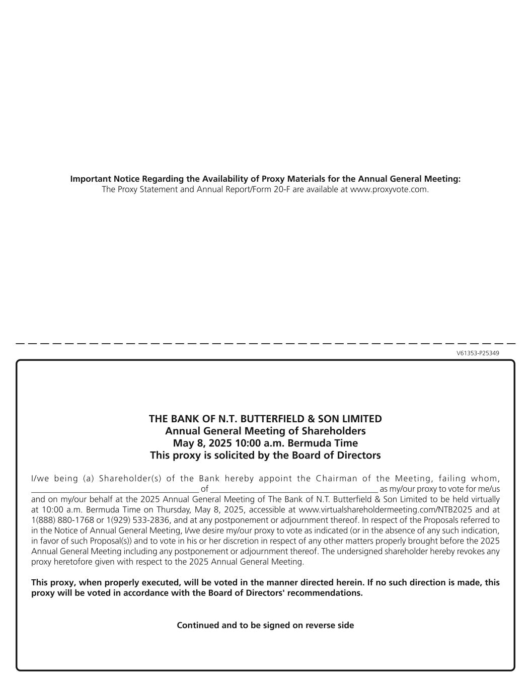 Important Notice Regarding the Availability of Proxy Materials for the Annual General Meeting: The Proxy Statement and Annual Report/Form 20-F are available at www.proxyvote.com. V61353-P25349 THE BANK OF N.T. BUTTERFIELD & SON LIMITED Annual General Meeting of Shareholders May 8, 2025 10:00 a.m. Bermuda Time This proxy is solicited by the Board of Directors I /we being (a) Shareholder(s) of the Bank hereby appoint the Chairman of the Meeting, fai l ing whom, _______________________________________ of _______________________________________ as my/our proxy to vote for me/us and on my/our behalf at the 2025 Annual General Meeting of The Bank of N.T. Butterfield & Son Limited to be held virtually at 10:00 a.m. Bermuda Time on Thursday, May 8, 2025, accessible at www.virtualshareholdermeeting.com/NTB2025 and at 1(888) 880-1768 or 1(929) 533-2836, and at any postponement or adjournment thereof. In respect of the Proposals referred to in the Notice of Annual General Meeting, I/we desire my/our proxy to vote as indicated (or in the absence of any such indication, in favor of such Proposal(s)) and to vote in his or her discretion in respect of any other matters properly brought before the 2025 Annual General Meeting including any postponement or adjournment thereof. The undersigned shareholder hereby revokes any proxy heretofore given with respect to the 2025 Annual General Meeting. This proxy, when properly executed, will be voted in the manner directed herein. If no such direction is made, this proxy will be voted in accordance with the Board of Directors' recommendations. Continued and to be signed on reverse side