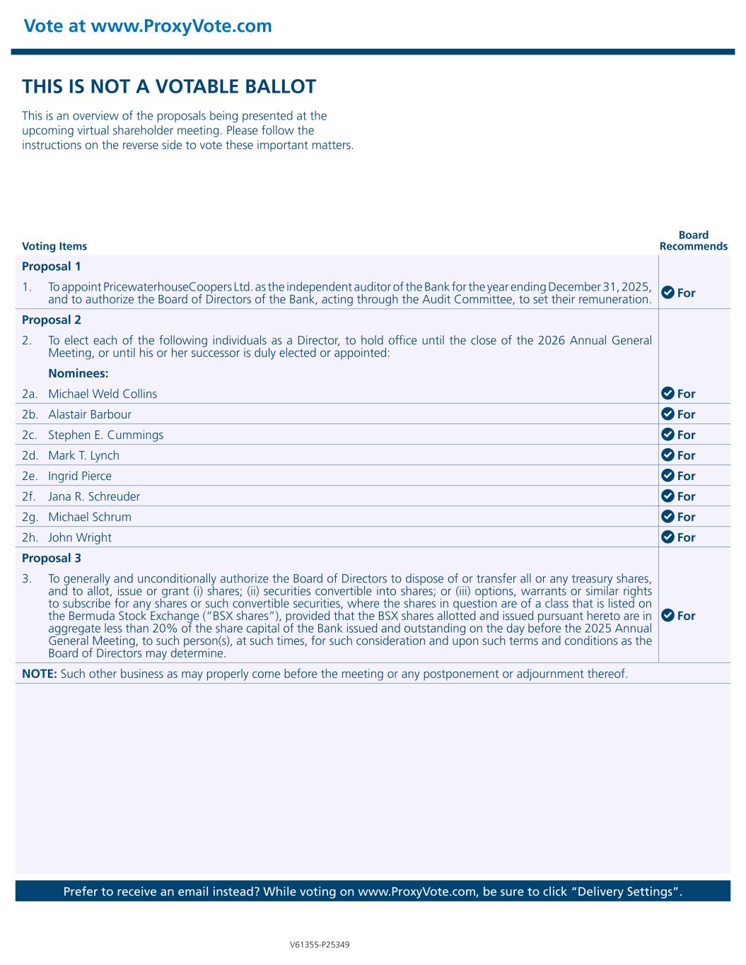 THIS IS NOT A VOTABLE BALLOT This is an overview of the proposals being presented at the upcoming virtual shareholder meeting. Please follow the instructions on the reverse side to vote these important matters. Vote at www.ProxyVote.com Prefer to receive an email instead? While voting on www.ProxyVote.com, be sure to click “Delivery Settings”. Voting Items Board Recommends V61355-P25349 Proposal 1 1. To appoint PricewaterhouseCoopers Ltd. as the independent auditor of the Bank for the year ending December 31, 2025, and to authorize the Board of Directors of the Bank, acting through the Audit Committee, to set their remuneration. For Proposal 2 2. To elect each of the following individuals as a Director, to hold office until the close of the 2026 Annual General Meeting, or until his or her successor is duly elected or appointed: Nominees: 2a. Michael Weld Collins For 2b. Alastair Barbour For 2c. Stephen E. Cummings For 2d. Mark T. Lynch For 2e. Ingrid Pierce For 2f. Jana R. Schreuder For 2g. Michael Schrum For 2h. John Wright For Proposal 3 3. To generally and unconditionally authorize the Board of Directors to dispose of or transfer all or any treasury shares, and to allot, issue or grant (i) shares; (ii) securities convertible into shares; or (iii) options, warrants or similar rights to subscribe for any shares or such convertible securities, where the shares in question are of a class that is listed on the Bermuda Stock Exchange (“BSX shares”), provided that the BSX shares allotted and issued pursuant hereto are in aggregate less than 20% of the share capital of the Bank issued and outstanding on the day before the 2025 Annual General Meeting, to such person(s), at such times, for such consideration and upon such terms and conditions as the Board of Directors may determine. For NOTE: Such other business as may properly come before the meeting or any postponement or adjournment thereof.