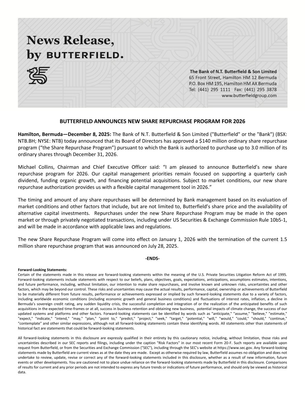 BUTTERFIELD ANNOUNCES NEW SHARE REPURCHASE PROGRAM FOR 2026 Hamilton, Bermuda—December 8, 2025: The Bank of N.T. Butterfield & Son Limited ("Butterfield" or the "Bank") (BSX: NTB.BH; NYSE: NTB) today announced that its Board of Directors has approved a $140 million ordinary share repurchase program (“the Share Repurchase Program”) pursuant to which the Bank is authorized to purchase up to 3.0 million of its ordinary shares through December 31, 2026. Michael Collins, Chairman and Chief Executive Officer said: “I am pleased to announce Butterfield’s new share repurchase program for 2026. Our capital management priorities remain focused on supporting a quarterly cash dividend, funding organic growth, and financing potential acquisitions. Subject to market conditions, our new share repurchase authorization provides us with a flexible capital management tool in 2026.” The timing and amount of any share repurchases will be determined by Bank management based on its evaluation of market conditions and other factors that include, but are not limited to, Butterfield’s share price and the availability of alternative capital investments. Repurchases under the new Share Repurchase Program may be made in the open market or through privately negotiated transactions, including under US Securities & Exchange Commission Rule 10b5-1, and will be made in accordance with applicable laws and regulations. The new Share Repurchase Program will come into effect on January 1, 2026 with the termination of the current 1.5 million share repurchase program that was announced on July 28, 2025. -ENDS- Forward-Looking Statements: Certain of the statements made in this release are forward-looking statements within the meaning of the U.S. Private Securities Litigation Reform Act of 1995. Forward-looking statements include statements with respect to our beliefs, plans, objectives, goals, expectations, anticipations, assumptions estimates, intentions, and future performance, including, without limitation, our intention to make share repurchases, and involve known and unknown risks, uncertainties and other factors, which may be beyond our control. These risks and uncertainties may cause the actual results, performance, capital, ownership or achievements of Butterfield to be materially different from future results, performance or achievements expressed or implied by such forward-looking statements due to a variety of factors, including worldwide economic conditions (including economic growth and general business conditions) and fluctuations of interest rates, inflation, a decline in Bermuda’s sovereign credit rating, any sudden liquidity crisis, the successful completion and integration of or the realization of the anticipated benefits of such acquisitions in the expected time-frames or at all, success in business retention and obtaining new business, potential impacts of climate change, the success of our updated systems and platforms and other factors. Forward-looking statements can be identified by words such as "anticipate," "assume," "believe," "estimate," "expect," "indicate," "intend," "may," "plan," "point to," "predict," "project," "seek," "target," "potential," "will," "would," "could," "should," "continue," "contemplate" and other similar expressions, although not all forward-looking statements contain these identifying words. All statements other than statements of historical fact are statements that could be forward-looking statements. All forward-looking statements in this disclosure are expressly qualified in their entirety by this cautionary notice, including, without limitation, those risks and uncertainties described in our SEC reports and filings, including under the caption "Risk Factors" in our most recent Form 20-F. Such reports are available upon request from Butterfield, or from the Securities and Exchange Commission ("SEC"), including through the SEC’s website at https://www.sec.gov. Any forward-looking statements made by Butterfield are current views as at the date they are made. Except as otherwise required by law, Butterfield assumes no obligation and does not undertake to review, update, revise or correct any of the forward-looking statements included in this disclosure, whether as a result of new information, future events or other developments. You are cautioned not to place undue reliance on the forward-looking statements made by Butterfield in this disclosure. Comparisons of results for current and any prior periods are not intended to express any future trends or indications of future performance, and should only be viewed as historical data.