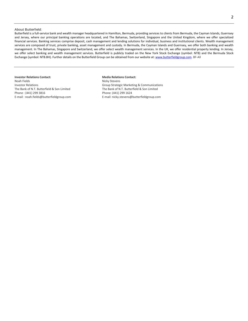 2 About Butterfield: Butterfield is a full-service bank and wealth manager headquartered in Hamilton, Bermuda, providing services to clients from Bermuda, the Cayman Islands, Guernsey and Jersey, where our principal banking operations are located, and The Bahamas, Switzerland, Singapore and the United Kingdom, where we offer specialized financial services. Banking services comprise deposit, cash management and lending solutions for individual, business and institutional clients. Wealth management services are composed of trust, private banking, asset management and custody. In Bermuda, the Cayman Islands and Guernsey, we offer both banking and wealth management. In The Bahamas, Singapore and Switzerland, we offer select wealth management services. In the UK, we offer residential property lending. In Jersey, we offer select banking and wealth management services. Butterfield is publicly traded on the New York Stock Exchange (symbol: NTB) and the Bermuda Stock Exchange (symbol: NTB.BH). Further details on the Butterfield Group can be obtained from our website at: www.butterfieldgroup.com. BF-All Investor Relations Contact: Media Relations Contact: Noah Fields Nicky Stevens Investor Relations Group Strategic Marketing & Communications The Bank of N.T. Butterfield & Son Limited The Bank of N.T. Butterfield & Son Limited Phone : (441) 299 3816 Phone: (441) 299 1624 E-mail : noah.fields@butterfieldgroup.com E-mail: nicky.stevens@butterfieldgroup.com