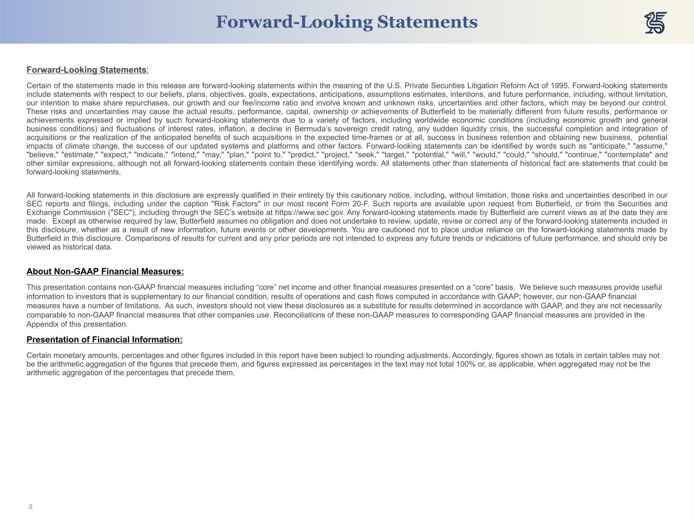 2 Forward-Looking Statements Forward-Looking Statements: Certain of the statements made in this release are forward-looking statements within the meaning of the U.S. Private Securities Litigation Reform Act of 1995. Forward-looking statements include statements with respect to our beliefs, plans, objectives, goals, expectations, anticipations, assumptions estimates, intentions, and future performance, including, without limitation, our intention to make share repurchases, our growth and our fee/income ratio and involve known and unknown risks, uncertainties and other factors, which may be beyond our control. These risks and uncertainties may cause the actual results, performance, capital, ownership or achievements of Butterfield to be materially different from future results, performance or achievements expressed or implied by such forward-looking statements due to a variety of factors, including worldwide economic conditions (including economic growth and general business conditions) and fluctuations of interest rates, inflation, a decline in Bermuda’s sovereign credit rating, any sudden liquidity crisis, the successful completion and integration of acquisitions or the realization of the anticipated benefits of such acquisitions in the expected time-frames or at all, success in business retention and obtaining new business, potential impacts of climate change, the success of our updated systems and platforms and other factors. Forward-looking statements can be identified by words such as "anticipate," "assume," "believe," "estimate," "expect," "indicate," "intend," "may," "plan," "point to," "predict," "project," "seek," "target," "potential," "will," "would," "could," "should," "continue," "contemplate" and other similar expressions, although not all forward-looking statements contain these identifying words. All statements other than statements of historical fact are statements that could be forward-looking statements. All forward-looking statements in this disclosure are expressly qualified in their entirety by this cautionary notice, including, without limitation, those risks and uncertainties described in our SEC reports and filings, including under the caption "Risk Factors" in our most recent Form 20-F. Such reports are available upon request from Butterfield, or from the Securities and Exchange Commission ("SEC"), including through the SEC’s website at https://www.sec.gov. Any forward-looking statements made by Butterfield are current views as at the date they are made. Except as otherwise required by law, Butterfield assumes no obligation and does not undertake to review, update, revise or correct any of the forward-looking statements included in this disclosure, whether as a result of new information, future events or other developments. You are cautioned not to place undue reliance on the forward-looking statements made by Butterfield in this disclosure. Comparisons of results for current and any prior periods are not intended to express any future trends or indications of future performance, and should only be viewed as historical data. About Non-GAAP Financial Measures: This presentation contains non-GAAP financial measures including “core” net income and other financial measures presented on a “core” basis. We believe such measures provide useful information to investors that is supplementary to our financial condition, results of operations and cash flows computed in accordance with GAAP; however, our non-GAAP financial measures have a number of limitations. As such, investors should not view these disclosures as a substitute for results determined in accordance with GAAP, and they are not necessarily comparable to non-GAAP financial measures that other companies use. Reconciliations of these non-GAAP measures to corresponding GAAP financial measures are provided in the Appendix of this presentation. Presentation of Financial Information: Certain monetary amounts, percentages and other figures included in this report have been subject to rounding adjustments. Accordingly, figures shown as totals in certain tables may not be the arithmetic aggregation of the figures that precede them, and figures expressed as percentages in the text may not total 100% or, as applicable, when aggregated may not be the arithmetic aggregation of the percentages that precede them.