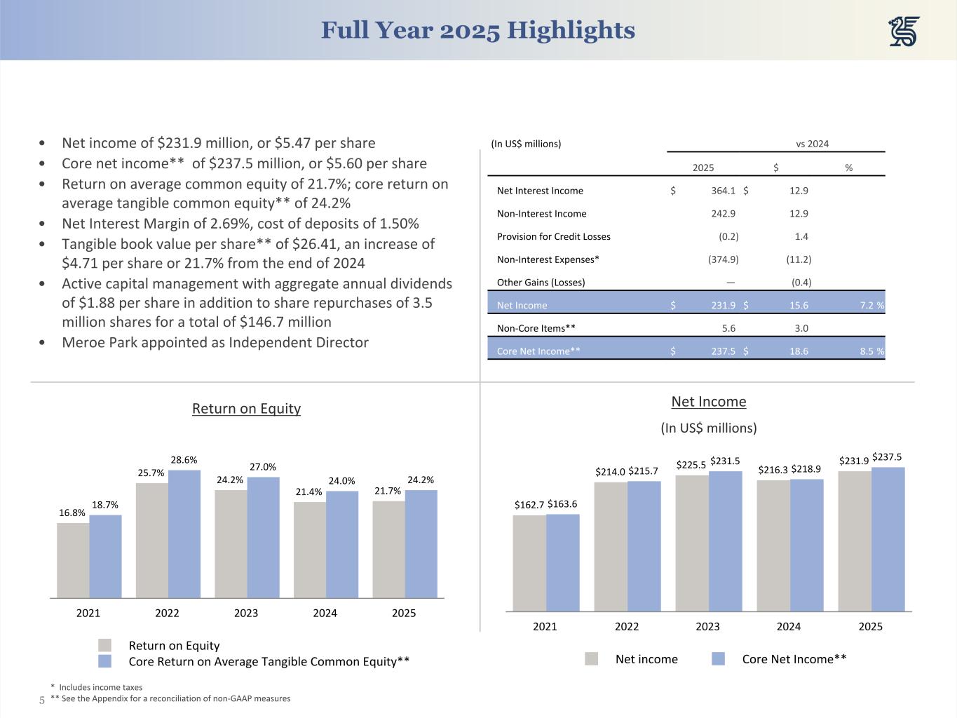 6 Fourth Quarter 2025 Highlights Net Income (In US$ millions) Return on Equity (In US$ millions) vs. Q3 2025 vs. Q4 2024 Q4 2025 $ % $ % Net Interest Income $ 92.6 $ (0.1) $ 4.0 Non-Interest Income 66.3 5.1 3.0 Provision for Credit Losses 0.2 0.7 0.4 Non-Interest Expenses* (95.3) (3.1) (3.1) Other Gains (Losses) — — (0.1) Net Income $ 63.8 $ 2.7 4.5 % $ 4.2 7.1 % Non-Core Items** — 2.2 — Core Net Income** $ 63.8 $ 0.5 0.8 % $ 4.2 7.1 % • Net income and core net income** of $63.8 million or $1.54 per share • Return on average common equity of 22.7%; core return on average tangible common equity** of 24.6% • Net Interest Margin of 2.69%, cost of deposits of 1.37% • Quarterly cash dividend of $0.50 per common share • Repurchases of 0.6 million shares at a total cost of $29.6 million • New share repurchase authorization for up to 3.0 million common shares * Includes income taxes ** See the Appendix for a reconciliation of non-GAAP measures $59.6 $53.8 $53.3 $61.1 $63.8 $59.6 $56.7 $53.7 $63.3 $63.8 Net income Core Net Income** Q4 2024 Q1 2025 Q2 2025 Q3 2025 Q4 2025 22.9% 20.9% 20.3% 22.5% 22.7% 25.2% 24.2% 22.3% 25.5% 24.6% Return on Equity Core Return on Average Tangible Common Equity** Q4 2024 Q1 2025 Q2 2025 Q3 2025 Q4 2025