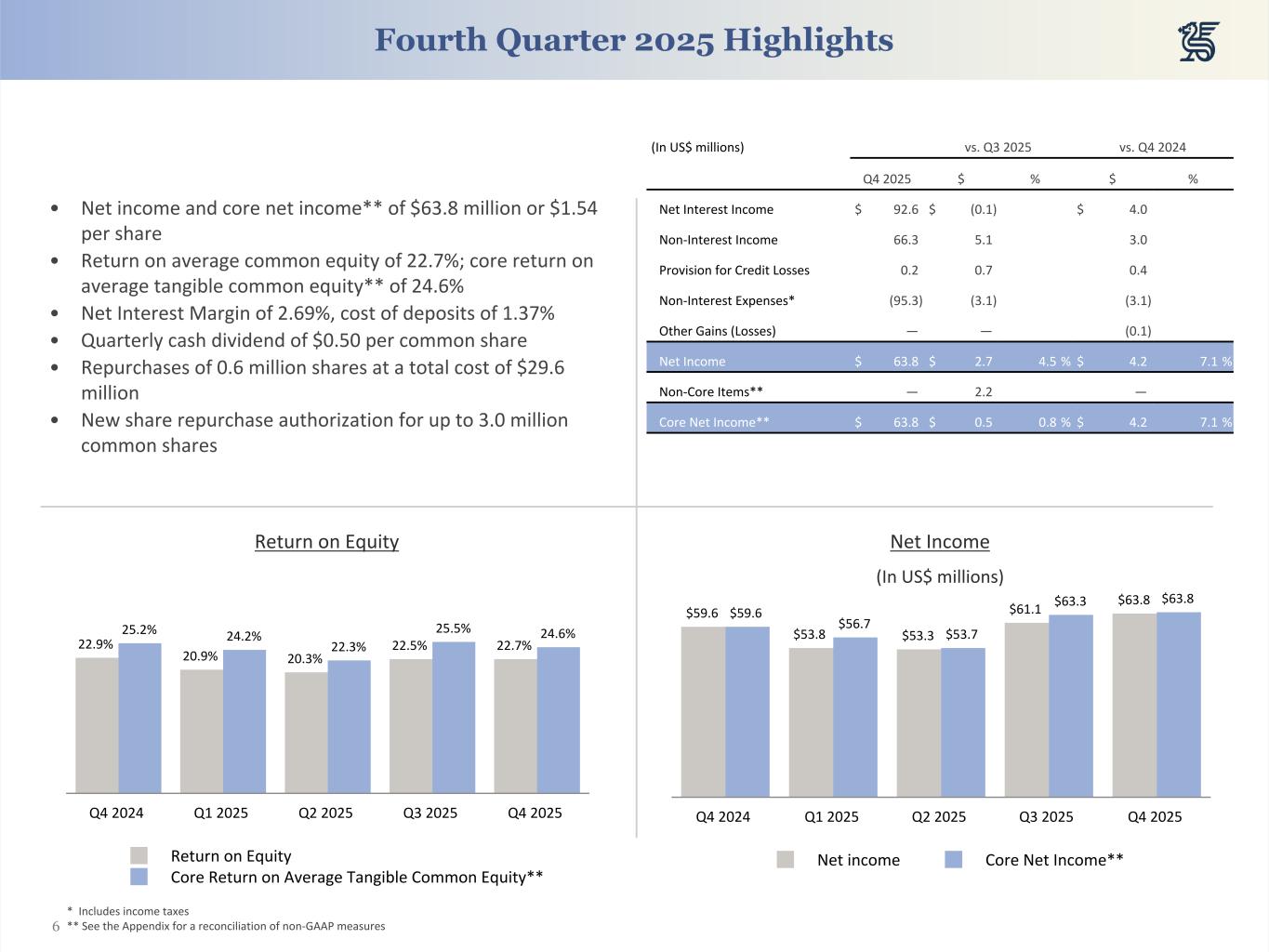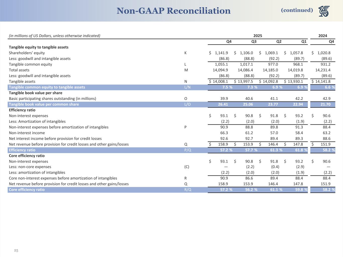 25 (in millions of US Dollars, unless otherwise indicated) 2025 2024 Q4 Q3 Q2 Q1 Q4 Tangible equity to tangible assets Shareholders' equity K $ 1,141.9 $ 1,106.0 $ 1,069.1 $ 1,057.8 $ 1,020.8 Less: goodwill and intangible assets (86.8) (88.8) (92.2) (89.7) (89.6) Tangible common equity L 1,055.1 1,017.1 977.0 968.1 931.2 Total assets M 14,094.9 14,086.4 14,185.0 14,019.8 14,231.4 Less: goodwill and intangible assets (86.8) (88.8) (92.2) (89.7) (89.6) Tangible assets N $ 14,008.1 $ 13,997.5 $ 14,092.8 $ 13,930.1 $ 14,141.8 Tangible common equity to tangible assets L/N 7.5 % 7.3 % 6.9 % 6.9 % 6.6 % Tangible book value per share Basic participating shares outstanding (in millions) O 39.9 40.6 41.1 42.2 42.9 Tangible book value per common share L/O 26.41 25.06 23.77 22.94 21.70 Efficiency ratio Non-interest expenses $ 93.1 $ 90.8 $ 91.8 $ 93.2 $ 90.6 Less: Amortization of intangibles (2.2) (2.0) (2.0) (1.9) (2.2) Non-interest expenses before amortization of intangibles P 90.9 88.8 89.8 91.3 88.4 Non-interest income 66.3 61.2 57.0 58.4 63.2 Net interest income before provision for credit losses 92.6 92.7 89.4 89.3 88.6 Net revenue before provision for credit losses and other gains/losses Q $ 158.9 $ 153.9 $ 146.4 $ 147.8 $ 151.9 Efficiency ratio P/Q 57.2 % 57.7 % 61.3 % 61.8 % 58.2 % Core efficiency ratio Non-interest expenses $ 93.1 $ 90.8 $ 91.8 $ 93.2 $ 90.6 Less: non-core expenses (C) — (2.2) (0.4) (2.9) — Less: amortization of intangibles (2.2) (2.0) (2.0) (1.9) (2.2) Core non-interest expenses before amortization of intangibles R 90.9 86.6 89.4 88.4 88.4 Net revenue before provision for credit losses and other gains/losses Q 158.9 153.9 146.4 147.8 151.9 Core efficiency ratio R/Q 57.2 % 56.2 % 61.1 % 59.8 % 58.2 % Non-GAAP Reconciliation (continued)