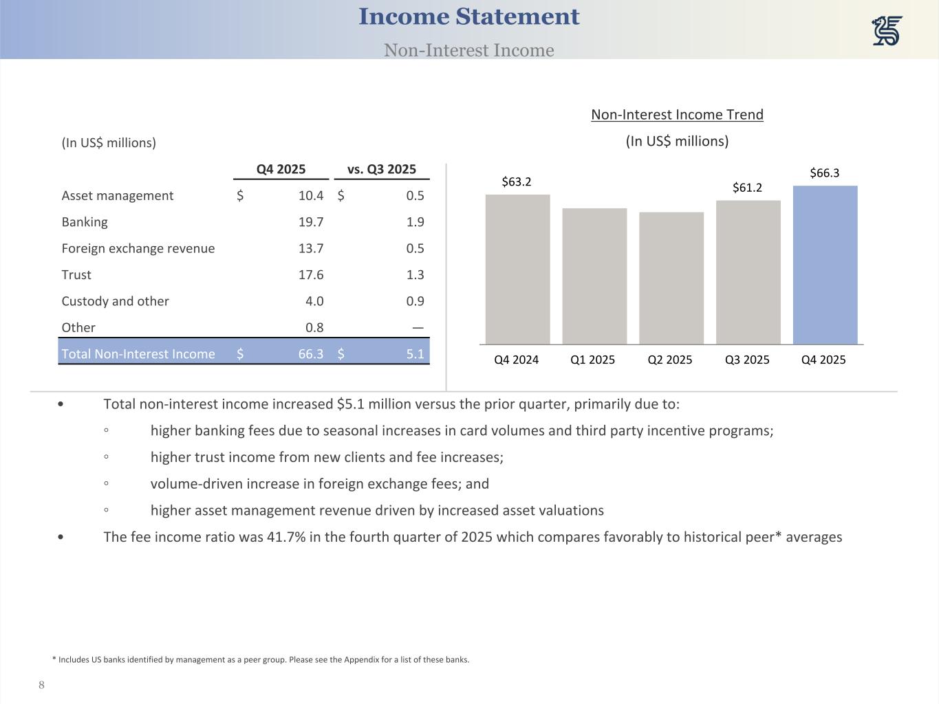 7 Net Interest Income before Provision for Credit Losses -Trend (In US$ millions) $88.6 $92.7 $92.6 Q4 2024 Q1 2025 Q2 2025 Q3 2025 Q4 2025 Net Interest Margin & Yields Income Statement Net Interest Income • Net interest income (“NII”) remained relatively flat compared to the prior quarter • Net interest margin (“NIM”) was lower at 2.69% compared to 2.73% in the prior quarter, primarily due to lower treasury and loan yields as central banks cut market interest rates • Average investment volumes continue to increase as assets were deployed into higher yielding available-for-sale investment securities • Average loan volumes continued to decrease as amortizations and paydowns outpaced originations (In US$ millions) Q4 2025 vs Q3 2025 Avg. Balance Yield Avg. Balance Yield Cash, S/T Inv. & Repos $ 3,588.7 3.44 % $ 114.0 (0.20) % Investments 5,686.1 2.72 % 160.0 0.05 % Loans (net) 4,396.3 6.01 % (74.6) (0.23) % Interest Earning Assets 13,671.1 3.97 % 199.4 (0.14) % Interest Bearing Liabilities 10,126.3 (1.73) % 109.1 0.12 % Net Interest Margin 2.69 % (0.04) %
