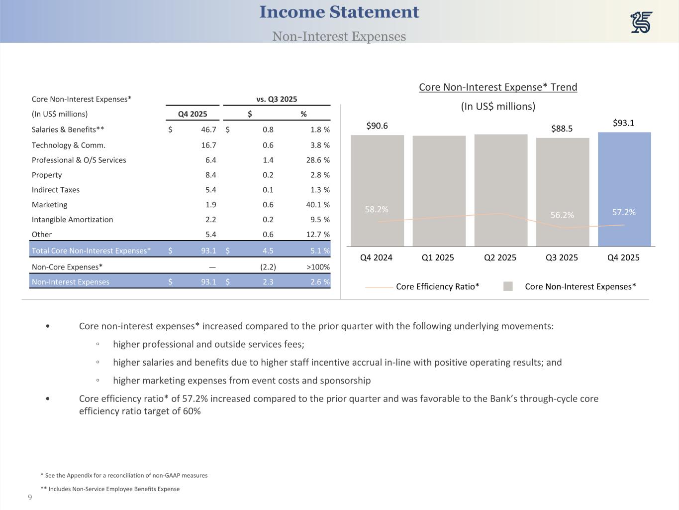 8 Non-Interest Income Trend (In US$ millions)(In US$ millions) Q4 2025 vs. Q3 2025 Asset management $ 10.4 $ 0.5 Banking 19.7 1.9 Foreign exchange revenue 13.7 0.5 Trust 17.6 1.3 Custody and other 4.0 0.9 Other 0.8 — Total Non-Interest Income $ 66.3 $ 5.1 $63.2 $61.2 $66.3 Q4 2024 Q1 2025 Q2 2025 Q3 2025 Q4 2025 • Total non-interest income increased $5.1 million versus the prior quarter, primarily due to: ◦ higher banking fees due to seasonal increases in card volumes and third party incentive programs; ◦ higher trust income from new clients and fee increases; ◦ volume-driven increase in foreign exchange fees; and ◦ higher asset management revenue driven by increased asset valuations • The fee income ratio was 41.7% in the fourth quarter of 2025 which compares favorably to historical peer* averages Income Statement Non-Interest Income * Includes US banks identified by management as a peer group. Please see the Appendix for a list of these banks.