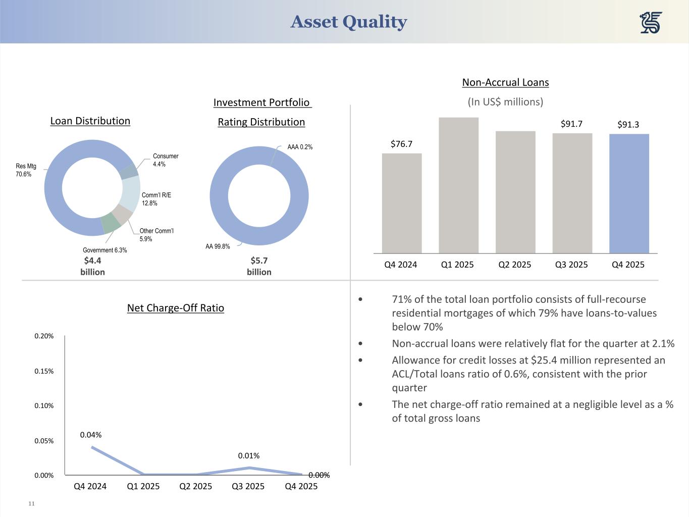11 Asset Quality Non-Accrual Loans (In US$ millions) $76.7 $91.7 $91.3 Q4 2024 Q1 2025 Q2 2025 Q3 2025 Q4 2025 Res Mtg 70.6% Consumer 4.4% Comm’l R/E 12.8% Other Comm’l 5.9% Government 6.3% Loan Distribution 0.04% 0.01% 0.00% Q4 2024 Q1 2025 Q2 2025 Q3 2025 Q4 2025 0.00% 0.05% 0.10% 0.15% 0.20% Net Charge-Off Ratio $4.4 billion $5.7 billion Investment Portfolio Rating Distribution • 71% of the total loan portfolio consists of full-recourse residential mortgages of which 79% have loans-to-values below 70% • Non-accrual loans were relatively flat for the quarter at 2.1% • Allowance for credit losses at $25.4 million represented an ACL/Total loans ratio of 0.6%, consistent with the prior quarter • The net charge-off ratio remained at a negligible level as a % of total gross loans AAA 0.2% AA 99.8%