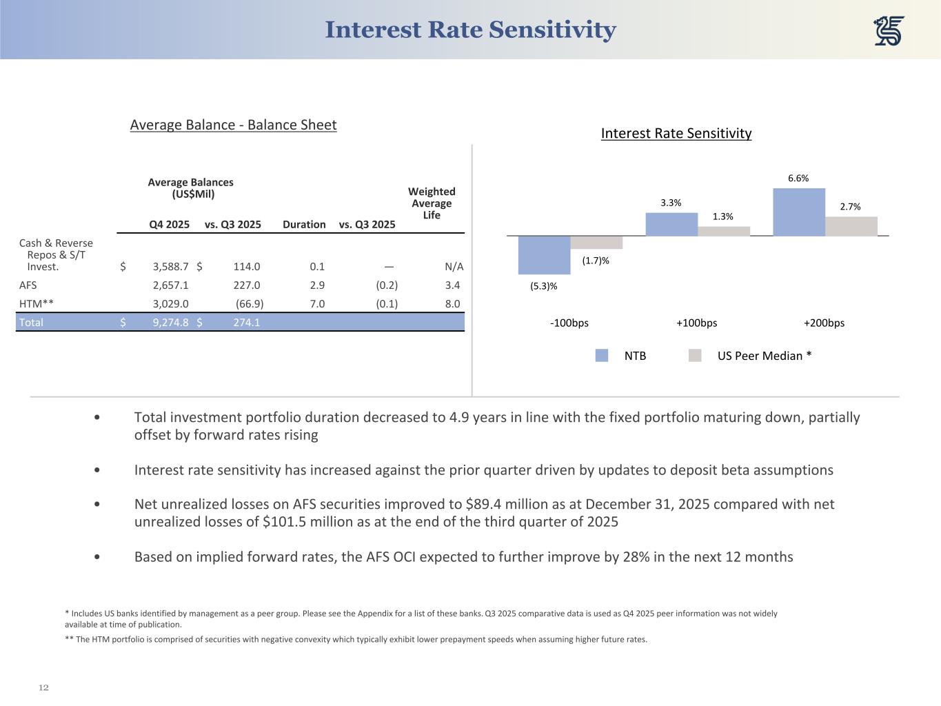 12 Interest Rate Sensitivity Interest Rate SensitivityAverage Balance - Balance Sheet Average Balances (US$Mil) Weighted Average Life Q4 2025 vs. Q3 2025 Duration vs. Q3 2025 Cash & Reverse Repos & S/T Invest. $ 3,588.7 $ 114.0 0.1 — N/A AFS 2,657.1 227.0 2.9 (0.2) 3.4 HTM** 3,029.0 (66.9) 7.0 (0.1) 8.0 Total $ 9,274.8 $ 274.1 (5.3)% 3.3% 6.6% (1.7)% 1.3% 2.7% NTB US Peer Median * -100bps +100bps +200bps • Total investment portfolio duration decreased to 4.9 years in line with the fixed portfolio maturing down, partially offset by forward rates rising • Interest rate sensitivity has increased against the prior quarter driven by updates to deposit beta assumptions • Net unrealized losses on AFS securities improved to $89.4 million as at December 31, 2025 compared with net unrealized losses of $101.5 million as at the end of the third quarter of 2025 • Based on implied forward rates, the AFS OCI expected to further improve by 28% in the next 12 months * Includes US banks identified by management as a peer group. Please see the Appendix for a list of these banks. Q3 2025 comparative data is used as Q4 2025 peer information was not widely available at time of publication. ** The HTM portfolio is comprised of securities with negative convexity which typically exhibit lower prepayment speeds when assuming higher future rates.