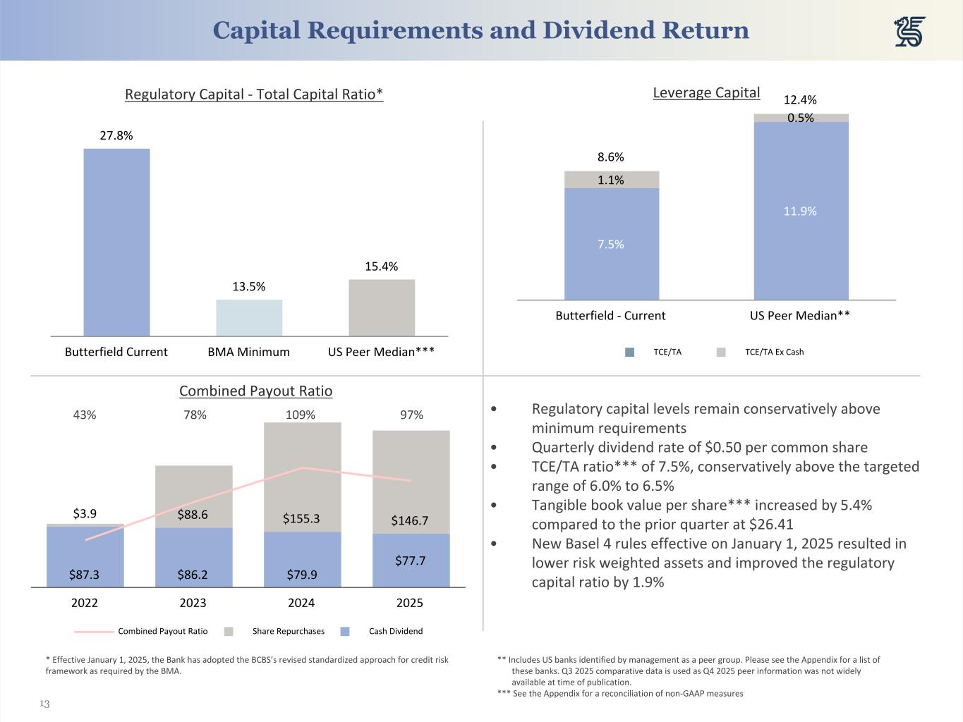 3 Agenda and Overview Ten International Locations Butterfield Overview Michael Collins Chairman and Chief Executive Officer Michael Schrum President and Group Chief Financial Officer Bri Hidalgo Group Chief Risk Officer • Leading Bank in Attractive Markets • Strong Capital Generation and Return • Resilient, Capital Efficient, Diversified Fee Revenue Model • Efficient, Conservative Balance Sheet • Experienced Leadership Team • Overview • Full Year 2025 Highlights • Fourth Quarter 2025 Financials • Q&A Presenters Agenda • Leading market positions in Bermuda & Cayman • Expanding retail offerings in The Channel Islands • Well-secured lending in all markets • Award winning banking and wealth management offerings Sustainability Awards