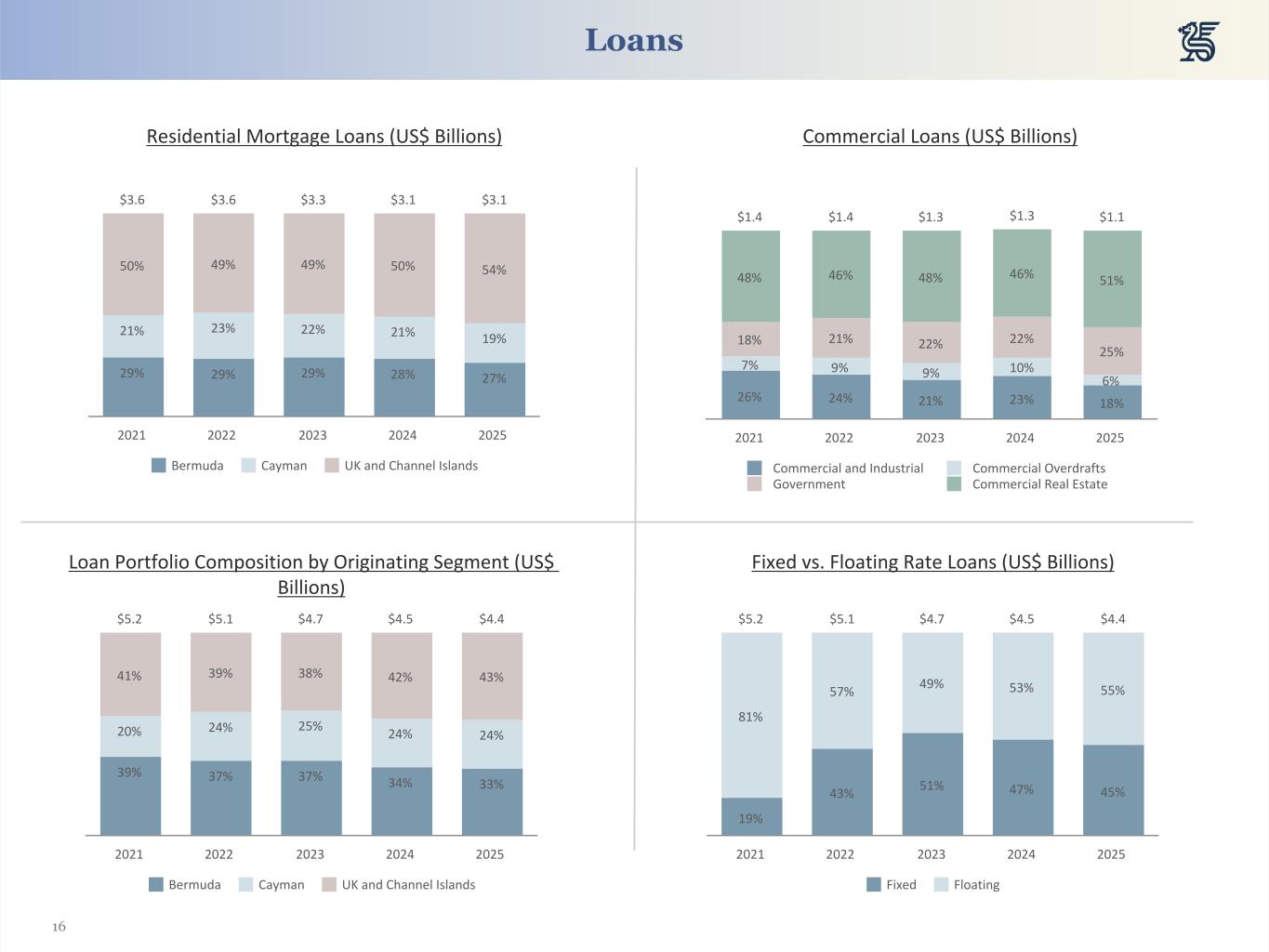 15 Group (US$ Billions) Bermuda (US$ Billions) Deposit Composition by Segment Cayman (US$ Billions) Channel Islands (US$ Billions) 21% 20% 20% 20% 21% 44% 49% 49% 49% 48% 35% 31% 31% 31% 31% $12.7 $12.6 $12.8 $12.7 $12.7 Q4 2024 Q1 2025 Q2 2025 Q3 2025 Q4 2025 27% 25% 24% 24% 27% 44% 47% 50% 50% 46% 30% 28% 26% 26% 27% $4.0 $3.9 $4.0 $3.8 $4.1 Q4 2024 Q1 2025 Q2 2025 Q3 2025 Q4 2025 33% 35% 36% 35% 35% 40% 45% 44% 46% 44% 26% 20% 20% 19% 21% $4.8 $4.5 $4.5 $4.8 $4.5 Q4 2024 Q1 2025 Q2 2025 Q3 2025 Q4 2025 1% 1% 1% 1% 1% 48% 54% 52% 49% 53% 51% 45% 48% 50% 46% $4.0 $4.2 $4.3 $4.2 $4.2 Q4 2024 Q1 2025 Q2 2025 Q3 2025 Q4 2025