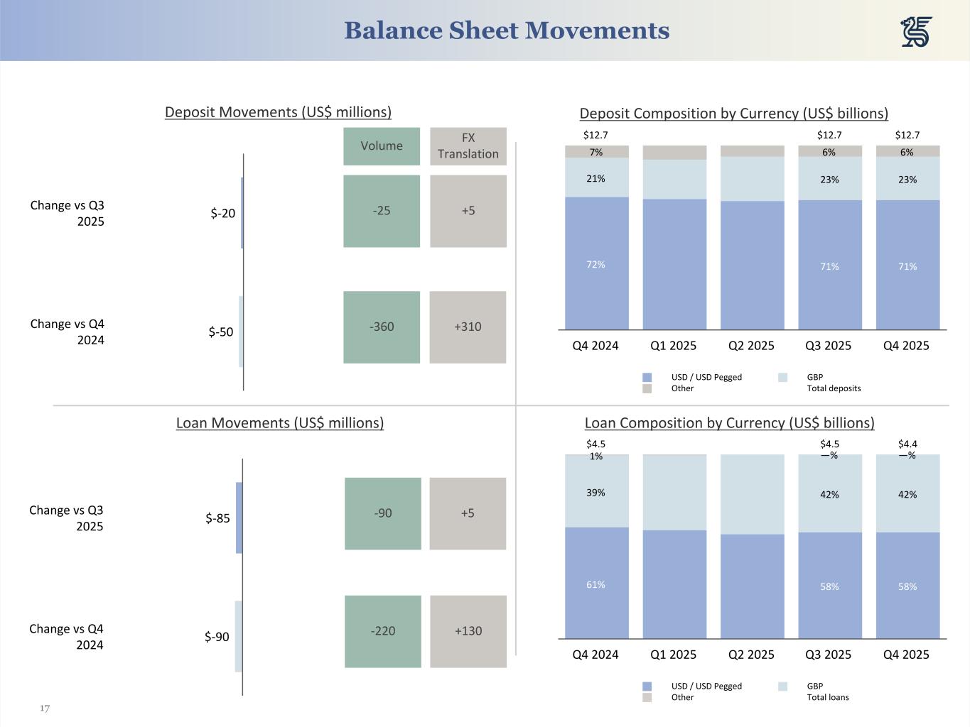 16 29% 29% 29% 28% 27% 21% 23% 22% 21% 19% 50% 49% 49% 50% 54% $3.6 $3.6 $3.3 $3.1 $3.1 Bermuda Cayman UK and Channel Islands 2021 2022 2023 2024 2025 26% 24% 21% 23% 18% 7% 9% 9% 10% 6% 18% 21% 22% 22% 25% 48% 46% 48% 46% 51% $1.4 $1.4 $1.3 $1.3 $1.1 Commercial and Industrial Commercial Overdrafts Government Commercial Real Estate 2021 2022 2023 2024 2025 Residential Mortgage Loans (US$ Billions) Commercial Loans (US$ Billions) Loans 39% 37% 37% 34% 33% 20% 24% 25% 24% 24% 41% 39% 38% 42% 43% $5.2 $5.1 $4.7 $4.5 $4.4 Bermuda Cayman UK and Channel Islands 2021 2022 2023 2024 2025 Loan Portfolio Composition by Originating Segment (US$ Billions) 19% 43% 51% 47% 45% 81% 57% 49% 53% 55% $5.2 $5.1 $4.7 $4.5 $4.4 Fixed Floating 2021 2022 2023 2024 2025 Fixed vs. Floating Rate Loans (US$ Billions)