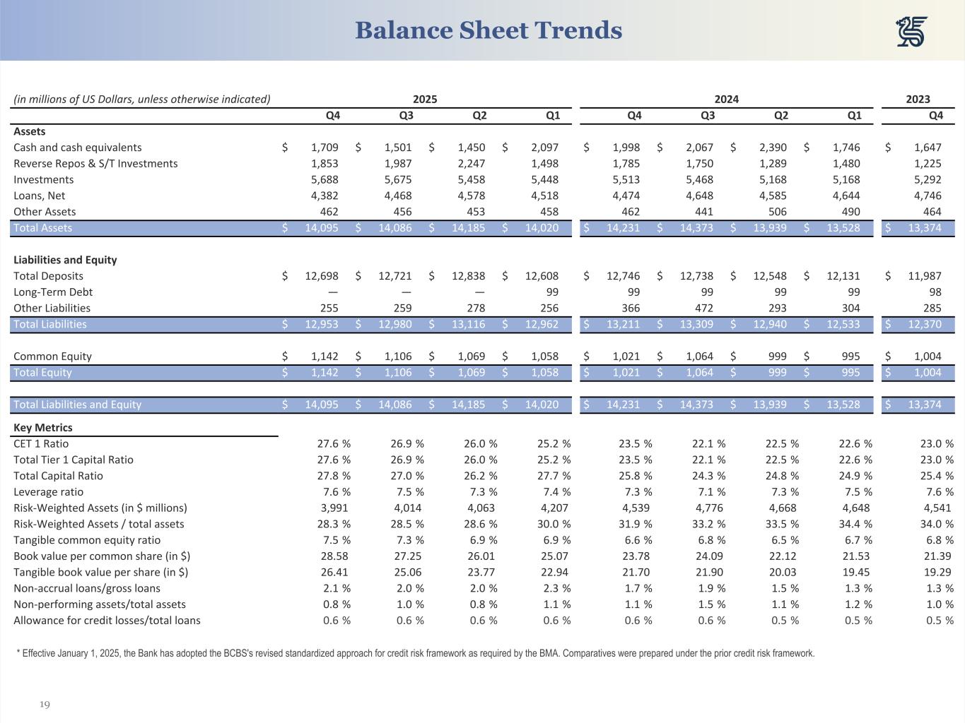 19 (in millions of US Dollars, unless otherwise indicated) 2025 2024 2023 Q4 Q3 Q2 Q1 Q4 Q3 Q2 Q1 Q4 Assets Cash and cash equivalents $ 1,709 $ 1,501 $ 1,450 $ 2,097 $ 1,998 $ 2,067 $ 2,390 $ 1,746 $ 1,647 Reverse Repos & S/T Investments 1,853 1,987 2,247 1,498 1,785 1,750 1,289 1,480 1,225 Investments 5,688 5,675 5,458 5,448 5,513 5,468 5,168 5,168 5,292 Loans, Net 4,382 4,468 4,578 4,518 4,474 4,648 4,585 4,644 4,746 Other Assets 462 456 453 458 462 441 506 490 464 Total Assets $ 14,095 $ 14,086 $ 14,185 $ 14,020 $ 14,231 $ 14,373 $ 13,939 $ 13,528 $ 13,374 Liabilities and Equity Total Deposits $ 12,698 $ 12,721 $ 12,838 $ 12,608 $ 12,746 $ 12,738 $ 12,548 $ 12,131 $ 11,987 Long-Term Debt — — — 99 99 99 99 99 98 Other Liabilities 255 259 278 256 366 472 293 304 285 Total Liabilities $ 12,953 $ 12,980 $ 13,116 $ 12,962 $ 13,211 $ 13,309 $ 12,940 $ 12,533 $ 12,370 Common Equity $ 1,142 $ 1,106 $ 1,069 $ 1,058 $ 1,021 $ 1,064 $ 999 $ 995 $ 1,004 Total Equity $ 1,142 $ 1,106 $ 1,069 $ 1,058 $ 1,021 $ 1,064 $ 999 $ 995 $ 1,004 Total Liabilities and Equity $ 14,095 $ 14,086 $ 14,185 $ 14,020 $ 14,231 $ 14,373 $ 13,939 $ 13,528 $ 13,374 Key Metrics CET 1 Ratio 27.6 % 26.9 % 26.0 % 25.2 % 23.5 % 22.1 % 22.5 % 22.6 % 23.0 % Total Tier 1 Capital Ratio 27.6 % 26.9 % 26.0 % 25.2 % 23.5 % 22.1 % 22.5 % 22.6 % 23.0 % Total Capital Ratio 27.8 % 27.0 % 26.2 % 27.7 % 25.8 % 24.3 % 24.8 % 24.9 % 25.4 % Leverage ratio 7.6 % 7.5 % 7.3 % 7.4 % 7.3 % 7.1 % 7.3 % 7.5 % 7.6 % Risk-Weighted Assets (in $ millions) 3,991 4,014 4,063 4,207 4,539 4,776 4,668 4,648 4,541 Risk-Weighted Assets / total assets 28.3 % 28.5 % 28.6 % 30.0 % 31.9 % 33.2 % 33.5 % 34.4 % 34.0 % Tangible common equity ratio 7.5 % 7.3 % 6.9 % 6.9 % 6.6 % 6.8 % 6.5 % 6.7 % 6.8 % Book value per common share (in $) 28.58 27.25 26.01 25.07 23.78 24.09 22.12 21.53 21.39 Tangible book value per share (in $) 26.41 25.06 23.77 22.94 21.70 21.90 20.03 19.45 19.29 Non-accrual loans/gross loans 2.1 % 2.0 % 2.0 % 2.3 % 1.7 % 1.9 % 1.5 % 1.3 % 1.3 % Non-performing assets/total assets 0.8 % 1.0 % 0.8 % 1.1 % 1.1 % 1.5 % 1.1 % 1.2 % 1.0 % Allowance for credit losses/total loans 0.6 % 0.6 % 0.6 % 0.6 % 0.6 % 0.6 % 0.5 % 0.5 % 0.5 % Balance Sheet Trends * Effective January 1, 2025, the Bank has adopted the BCBS's revised standardized approach for credit risk framework as required by the BMA. Comparatives were prepared under the prior credit risk framework.