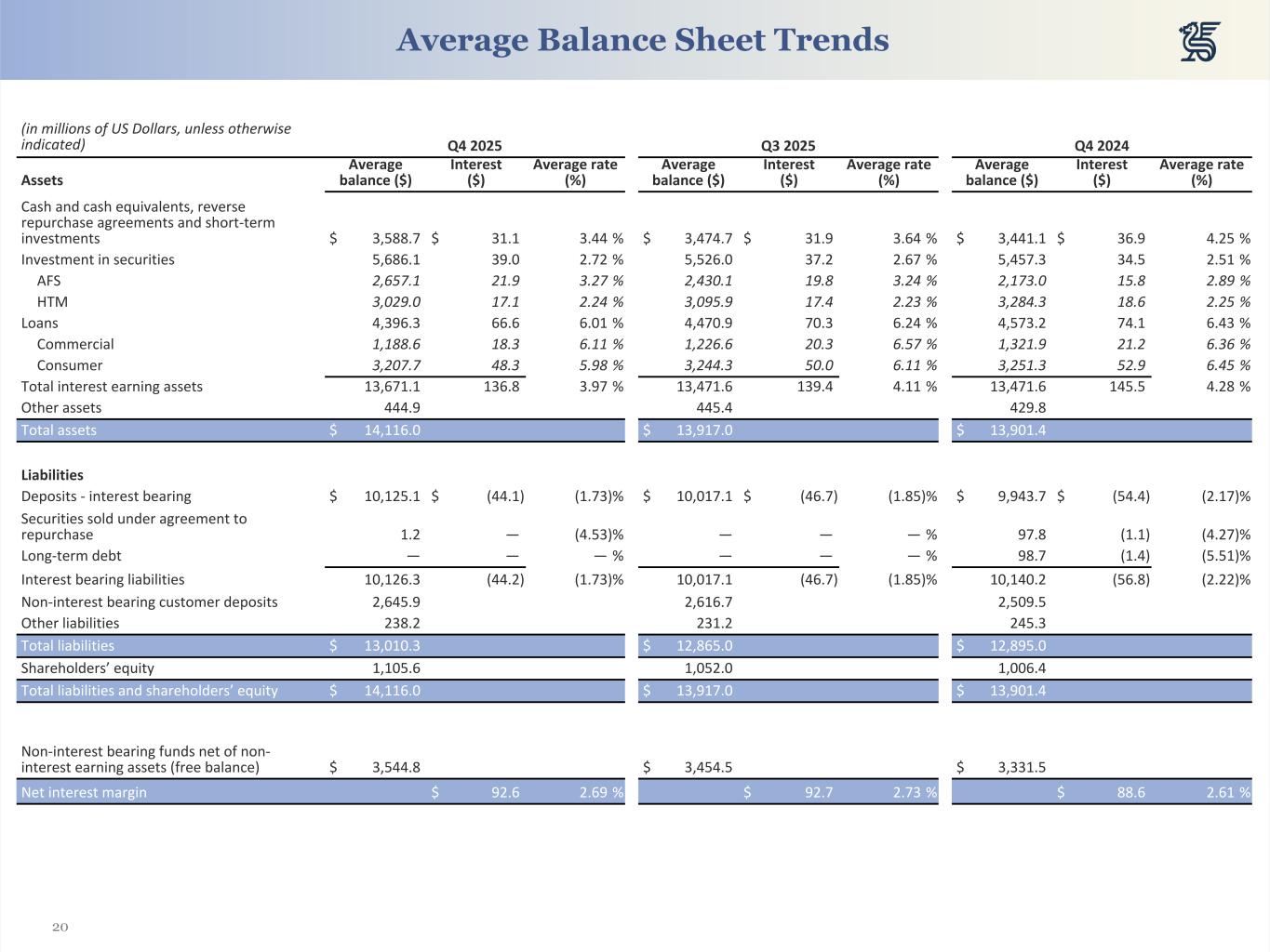 20 (in millions of US Dollars, unless otherwise indicated) Q4 2025 Q3 2025 Q4 2024 Assets Average balance ($) Interest ($) Average rate (%) Average balance ($) Interest ($) Average rate (%) Average balance ($) Interest ($) Average rate (%) Cash and cash equivalents, reverse repurchase agreements and short-term investments $ 3,588.7 $ 31.1 3.44 % $ 3,474.7 $ 31.9 3.64 % $ 3,441.1 $ 36.9 4.25 % Investment in securities 5,686.1 39.0 2.72 % 5,526.0 37.2 2.67 % 5,457.3 34.5 2.51 % AFS 2,657.1 21.9 3.27 % 2,430.1 19.8 3.24 % 2,173.0 15.8 2.89 % HTM 3,029.0 17.1 2.24 % 3,095.9 17.4 2.23 % 3,284.3 18.6 2.25 % Loans 4,396.3 66.6 6.01 % 4,470.9 70.3 6.24 % 4,573.2 74.1 6.43 % Commercial 1,188.6 18.3 6.11 % 1,226.6 20.3 6.57 % 1,321.9 21.2 6.36 % Consumer 3,207.7 48.3 5.98 % 3,244.3 50.0 6.11 % 3,251.3 52.9 6.45 % Total interest earning assets 13,671.1 136.8 3.97 % 13,471.6 139.4 4.11 % 13,471.6 145.5 4.28 % Other assets 444.9 445.4 429.8 Total assets $ 14,116.0 $ 13,917.0 $ 13,901.4 Liabilities Deposits - interest bearing $ 10,125.1 $ (44.1) (1.73) % $ 10,017.1 $ (46.7) (1.85) % $ 9,943.7 $ (54.4) (2.17) % Securities sold under agreement to repurchase 1.2 — (4.53) % — — — % 97.8 (1.1) (4.27) % Long-term debt — — — % — — — % 98.7 (1.4) (5.51) % Interest bearing liabilities 10,126.3 (44.2) (1.73) % 10,017.1 (46.7) (1.85) % 10,140.2 (56.8) (2.22) % Non-interest bearing customer deposits 2,645.9 2,616.7 2,509.5 Other liabilities 238.2 231.2 245.3 Total liabilities $ 13,010.3 $ 12,865.0 $ 12,895.0 Shareholders’ equity 1,105.6 1,052.0 1,006.4 Total liabilities and shareholders’ equity $ 14,116.0 $ 13,917.0 $ 13,901.4 Non-interest bearing funds net of non- interest earning assets (free balance) $ 3,544.8 $ 3,454.5 $ 3,331.5 Net interest margin $ 92.6 2.69 % $ 92.7 2.73 % $ 88.6 2.61 % Average Balance Sheet Trends