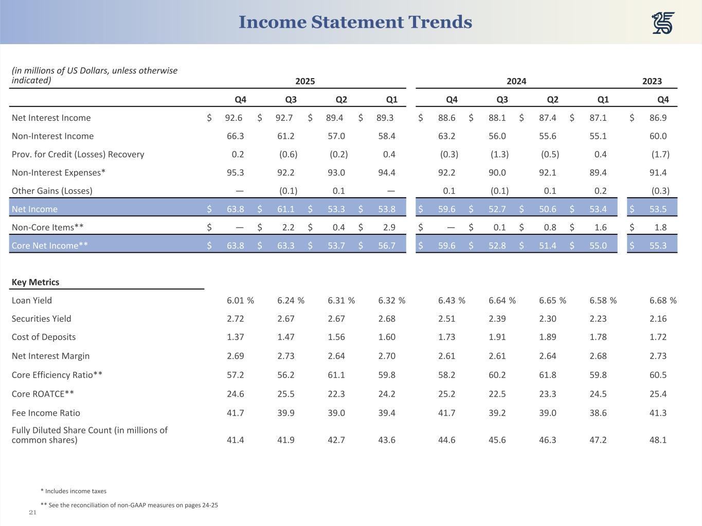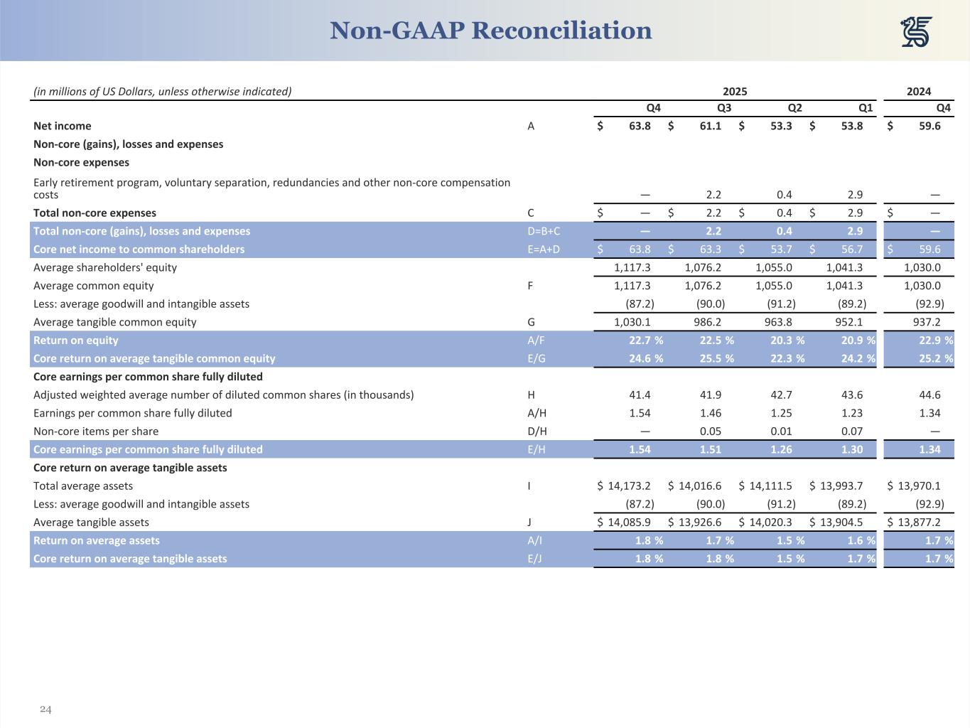24 (in millions of US Dollars, unless otherwise indicated) 2025 2024 Q4 Q3 Q2 Q1 Q4 Net income A $ 63.8 $ 61.1 $ 53.3 $ 53.8 $ 59.6 Non-core (gains), losses and expenses Non-core expenses Early retirement program, voluntary separation, redundancies and other non-core compensation costs — 2.2 0.4 2.9 — Total non-core expenses C $ — $ 2.2 $ 0.4 $ 2.9 $ — Total non-core (gains), losses and expenses D=B+C — 2.2 0.4 2.9 — Core net income to common shareholders E=A+D $ 63.8 $ 63.3 $ 53.7 $ 56.7 $ 59.6 Average shareholders' equity 1,117.3 1,076.2 1,055.0 1,041.3 1,030.0 Average common equity F 1,117.3 1,076.2 1,055.0 1,041.3 1,030.0 Less: average goodwill and intangible assets (87.2) (90.0) (91.2) (89.2) (92.9) Average tangible common equity G 1,030.1 986.2 963.8 952.1 937.2 Return on equity A/F 22.7 % 22.5 % 20.3 % 20.9 % 22.9 % Core return on average tangible common equity E/G 24.6 % 25.5 % 22.3 % 24.2 % 25.2 % Core earnings per common share fully diluted Adjusted weighted average number of diluted common shares (in thousands) H 41.4 41.9 42.7 43.6 44.6 Earnings per common share fully diluted A/H 1.54 1.46 1.25 1.23 1.34 Non-core items per share D/H — 0.05 0.01 0.07 — Core earnings per common share fully diluted E/H 1.54 1.51 1.26 1.30 1.34 Core return on average tangible assets Total average assets I $ 14,173.2 $ 14,016.6 $ 14,111.5 $ 13,993.7 $ 13,970.1 Less: average goodwill and intangible assets (87.2) (90.0) (91.2) (89.2) (92.9) Average tangible assets J $ 14,085.9 $ 13,926.6 $ 14,020.3 $ 13,904.5 $ 13,877.2 Return on average assets A/I 1.8 % 1.7 % 1.5 % 1.6 % 1.7 % Core return on average tangible assets E/J 1.8 % 1.8 % 1.5 % 1.7 % 1.7 % Non-GAAP Reconciliation