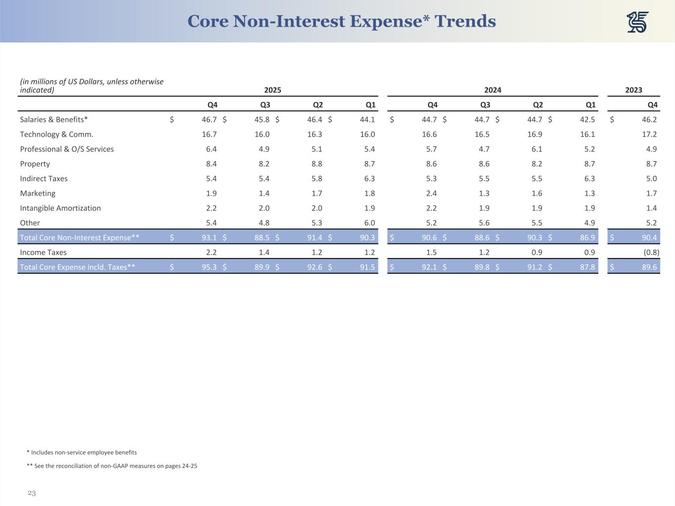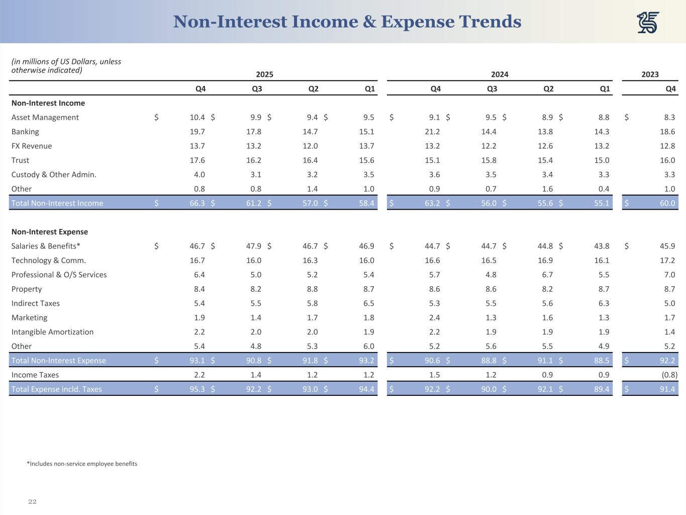 22 (in millions of US Dollars, unless otherwise indicated) 2025 2024 2023 Q4 Q3 Q2 Q1 Q4 Q3 Q2 Q1 Q4 Non-Interest Income Asset Management $ 10.4 $ 9.9 $ 9.4 $ 9.5 $ 9.1 $ 9.5 $ 8.9 $ 8.8 $ 8.3 Banking 19.7 17.8 14.7 15.1 21.2 14.4 13.8 14.3 18.6 FX Revenue 13.7 13.2 12.0 13.7 13.2 12.2 12.6 13.2 12.8 Trust 17.6 16.2 16.4 15.6 15.1 15.8 15.4 15.0 16.0 Custody & Other Admin. 4.0 3.1 3.2 3.5 3.6 3.5 3.4 3.3 3.3 Other 0.8 0.8 1.4 1.0 0.9 0.7 1.6 0.4 1.0 Total Non-Interest Income $ 66.3 $ 61.2 $ 57.0 $ 58.4 $ 63.2 $ 56.0 $ 55.6 $ 55.1 $ 60.0 Non-Interest Expense Salaries & Benefits* $ 46.7 $ 47.9 $ 46.7 $ 46.9 $ 44.7 $ 44.7 $ 44.8 $ 43.8 $ 45.9 Technology & Comm. 16.7 16.0 16.3 16.0 16.6 16.5 16.9 16.1 17.2 Professional & O/S Services 6.4 5.0 5.2 5.4 5.7 4.8 6.7 5.5 7.0 Property 8.4 8.2 8.8 8.7 8.6 8.6 8.2 8.7 8.7 Indirect Taxes 5.4 5.5 5.8 6.5 5.3 5.5 5.6 6.3 5.0 Marketing 1.9 1.4 1.7 1.8 2.4 1.3 1.6 1.3 1.7 Intangible Amortization 2.2 2.0 2.0 1.9 2.2 1.9 1.9 1.9 1.4 Other 5.4 4.8 5.3 6.0 5.2 5.6 5.5 4.9 5.2 Total Non-Interest Expense $ 93.1 $ 90.8 $ 91.8 $ 93.2 $ 90.6 $ 88.8 $ 91.1 $ 88.5 $ 92.2 Income Taxes 2.2 1.4 1.2 1.2 1.5 1.2 0.9 0.9 (0.8) Total Expense incld. Taxes $ 95.3 $ 92.2 $ 93.0 $ 94.4 $ 92.2 $ 90.0 $ 92.1 $ 89.4 $ 91.4 *Includes non-service employee benefits Non-Interest Income & Expense Trends