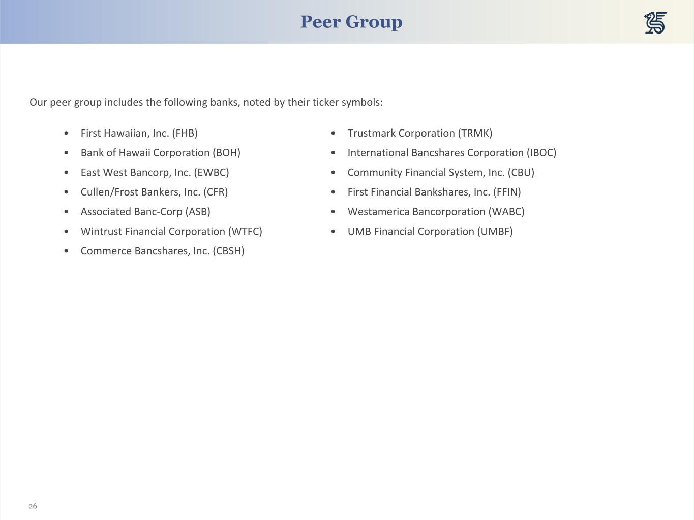 26 Our peer group includes the following banks, noted by their ticker symbols: Peer Group • First Hawaiian, Inc. (FHB) • Bank of Hawaii Corporation (BOH) • East West Bancorp, Inc. (EWBC) • Cullen/Frost Bankers, Inc. (CFR) • Associated Banc-Corp (ASB) • Wintrust Financial Corporation (WTFC) • Commerce Bancshares, Inc. (CBSH) • Trustmark Corporation (TRMK) • International Bancshares Corporation (IBOC) • Community Financial System, Inc. (CBU) • First Financial Bankshares, Inc. (FFIN) • Westamerica Bancorporation (WABC) • UMB Financial Corporation (UMBF)