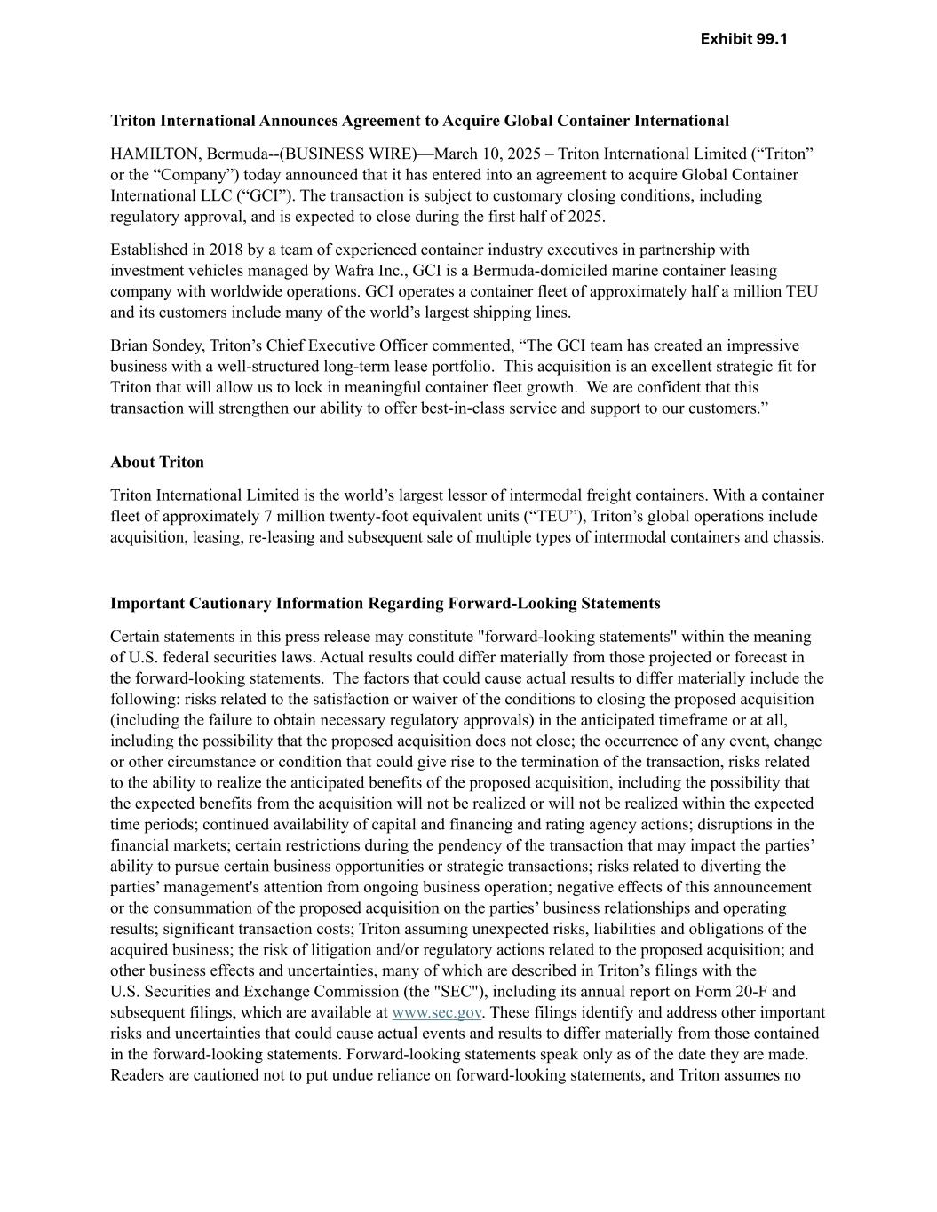 Triton International Announces Agreement to Acquire Global Container International HAMILTON, Bermuda--(BUSINESS WIRE)—March 10, 2025 – Triton International Limited (“Triton” or the “Company”) today announced that it has entered into an agreement to acquire Global Container International LLC (“GCI”). The transaction is subject to customary closing conditions, including regulatory approval, and is expected to close during the first half of 2025. Established in 2018 by a team of experienced container industry executives in partnership with investment vehicles managed by Wafra Inc., GCI is a Bermuda-domiciled marine container leasing company with worldwide operations. GCI operates a container fleet of approximately half a million TEU and its customers include many of the world’s largest shipping lines. Brian Sondey, Triton’s Chief Executive Officer commented, “The GCI team has created an impressive business with a well-structured long-term lease portfolio. This acquisition is an excellent strategic fit for Triton that will allow us to lock in meaningful container fleet growth. We are confident that this transaction will strengthen our ability to offer best-in-class service and support to our customers.” About Triton Triton International Limited is the world’s largest lessor of intermodal freight containers. With a container fleet of approximately 7 million twenty-foot equivalent units (“TEU”), Triton’s global operations include acquisition, leasing, re-leasing and subsequent sale of multiple types of intermodal containers and chassis. Important Cautionary Information Regarding Forward-Looking Statements Certain statements in this press release may constitute "forward-looking statements" within the meaning of U.S. federal securities laws. Actual results could differ materially from those projected or forecast in the forward-looking statements. The factors that could cause actual results to differ materially include the following: risks related to the satisfaction or waiver of the conditions to closing the proposed acquisition (including the failure to obtain necessary regulatory approvals) in the anticipated timeframe or at all, including the possibility that the proposed acquisition does not close; the occurrence of any event, change or other circumstance or condition that could give rise to the termination of the transaction, risks related to the ability to realize the anticipated benefits of the proposed acquisition, including the possibility that the expected benefits from the acquisition will not be realized or will not be realized within the expected time periods; continued availability of capital and financing and rating agency actions; disruptions in the financial markets; certain restrictions during the pendency of the transaction that may impact the parties’ ability to pursue certain business opportunities or strategic transactions; risks related to diverting the parties’ management's attention from ongoing business operation; negative effects of this announcement or the consummation of the proposed acquisition on the parties’ business relationships and operating results; significant transaction costs; Triton assuming unexpected risks, liabilities and obligations of the acquired business; the risk of litigation and/or regulatory actions related to the proposed acquisition; and other business effects and uncertainties, many of which are described in Triton’s filings with the U.S. Securities and Exchange Commission (the "SEC"), including its annual report on Form 20-F and subsequent filings, which are available at www.sec.gov. These filings identify and address other important risks and uncertainties that could cause actual events and results to differ materially from those contained in the forward-looking statements. Forward-looking statements speak only as of the date they are made. Readers are cautioned not to put undue reliance on forward-looking statements, and Triton assumes no Exhibit 99.1