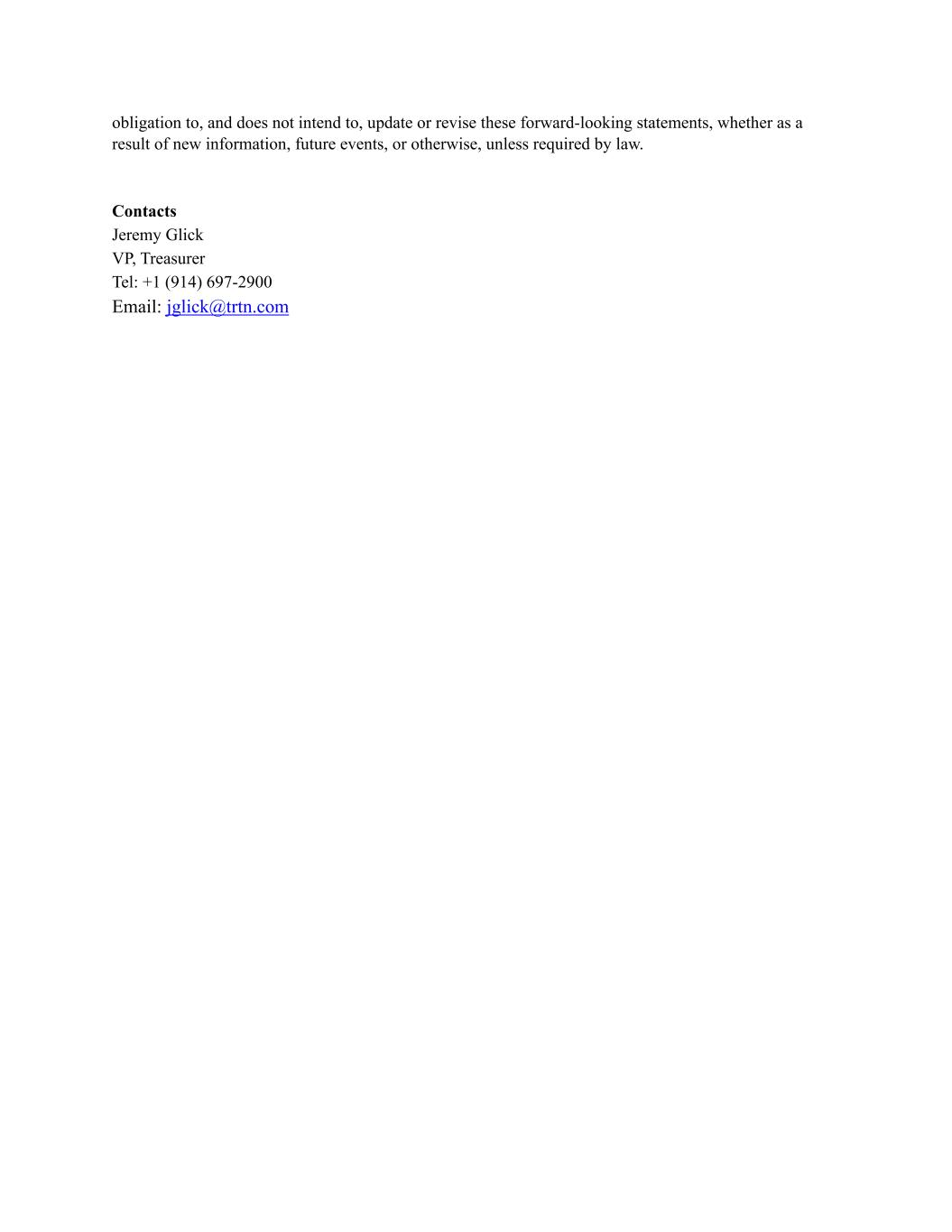 obligation to, and does not intend to, update or revise these forward-looking statements, whether as a result of new information, future events, or otherwise, unless required by law. Contacts Jeremy Glick VP, Treasurer Tel: +1 (914) 697-2900 Email: jglick@trtn.com