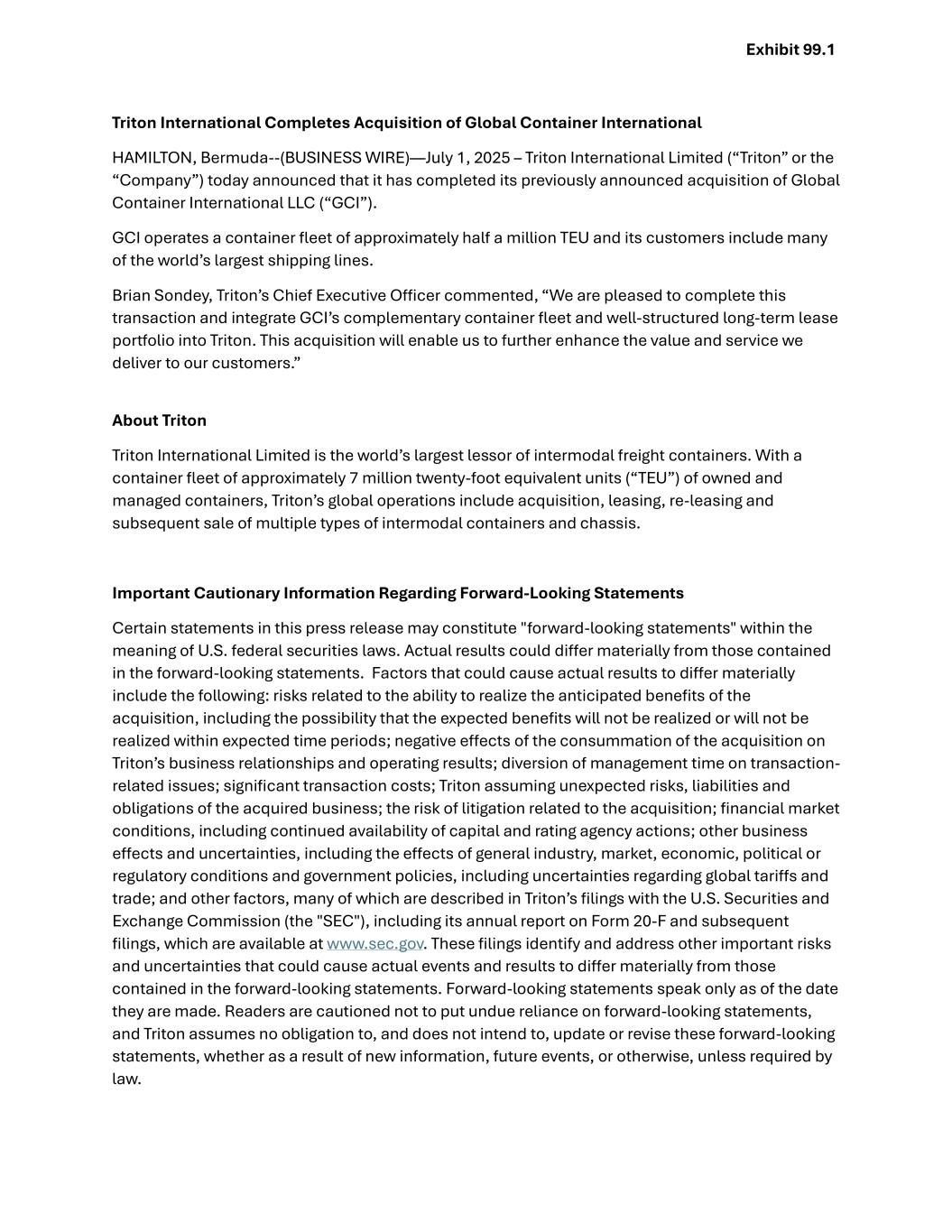 Triton International Completes Acquisition of Global Container International HAMILTON, Bermuda--(BUSINESS WIRE)—July 1, 2025 – Triton International Limited (“Triton” or the “Company”) today announced that it has completed its previously announced acquisition of Global Container International LLC (“GCI”). GCI operates a container fleet of approximately half a million TEU and its customers include many of the world’s largest shipping lines. Brian Sondey, Triton’s Chief Executive Officer commented, “We are pleased to complete this transaction and integrate GCI’s complementary container fleet and well-structured long-term lease portfolio into Triton. This acquisition will enable us to further enhance the value and service we deliver to our customers.” About Triton Triton International Limited is the world’s largest lessor of intermodal freight containers. With a container fleet of approximately 7 million twenty-foot equivalent units (“TEU”) of owned and managed containers, Triton’s global operations include acquisition, leasing, re-leasing and subsequent sale of multiple types of intermodal containers and chassis. Important Cautionary Information Regarding Forward-Looking Statements Certain statements in this press release may constitute "forward-looking statements" within the meaning of U.S. federal securities laws. Actual results could differ materially from those contained in the forward-looking statements. Factors that could cause actual results to differ materially include the following: risks related to the ability to realize the anticipated benefits of the acquisition, including the possibility that the expected benefits will not be realized or will not be realized within expected time periods; negative effects of the consummation of the acquisition on Triton’s business relationships and operating results; diversion of management time on transaction- related issues; significant transaction costs; Triton assuming unexpected risks, liabilities and obligations of the acquired business; the risk of litigation related to the acquisition; financial market conditions, including continued availability of capital and rating agency actions; other business effects and uncertainties, including the effects of general industry, market, economic, political or regulatory conditions and government policies, including uncertainties regarding global tariffs and trade; and other factors, many of which are described in Triton’s filings with the U.S. Securities and Exchange Commission (the "SEC"), including its annual report on Form 20-F and subsequent filings, which are available at www.sec.gov. These filings identify and address other important risks and uncertainties that could cause actual events and results to differ materially from those contained in the forward-looking statements. Forward-looking statements speak only as of the date they are made. Readers are cautioned not to put undue reliance on forward-looking statements, and Triton assumes no obligation to, and does not intend to, update or revise these forward-looking statements, whether as a result of new information, future events, or otherwise, unless required by law. Exhibit 99.1