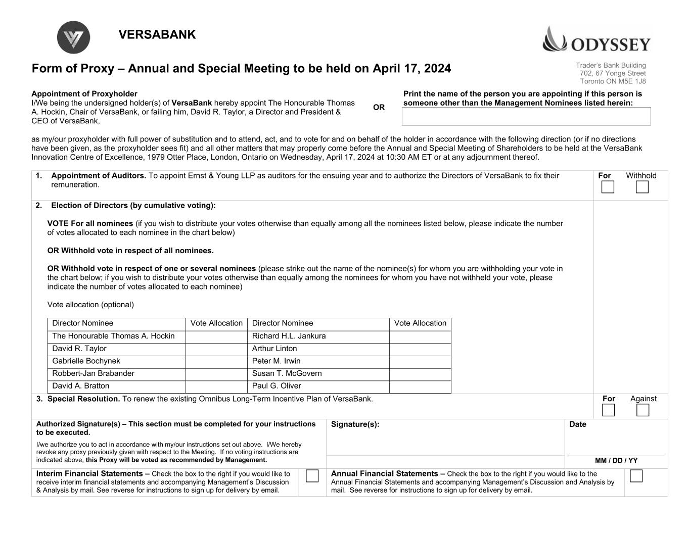 Appointment of Proxyholder I/We being the undersigned holder(s) of VersaBank hereby appoint The Honourable Thomas A. Hockin, Chair of VersaBank, or failing him, David R. Taylor, a Director and President & CEO of VersaBank, OR Print the name of the person you are appointing if this person is someone other than the Management Nominees listed herein: as my/our proxyholder with full power of substitution and to attend, act, and to vote for and on behalf of the holder in accordance with the following direction (or if no directions have been given, as the proxyholder sees fit) and all other matters that may properly come before the Annual and Special Meeting of Shareholders to be held at the VersaBank Innovation Centre of Excellence, 1979 Otter Place, London, Ontario on Wednesday, April 17, 2024 at 10:30 AM ET or at any adjournment thereof. 1. Appointment of Auditors. To appoint Ernst & Young LLP as auditors for the ensuing year and to authorize the Directors of VersaBank to fix their remuneration. For Withhold 2. Election of Directors (by cumulative voting): VOTE For all nominees (if you wish to distribute your votes otherwise than equally among all the nominees listed below, please indicate the number of votes allocated to each nominee in the chart below) OR Withhold vote in respect of all nominees. OR Withhold vote in respect of one or several nominees (please strike out the name of the nominee(s) for whom you are withholding your vote in the chart below; if you wish to distribute your votes otherwise than equally among the nominees for whom you have not withheld your vote, please indicate the number of votes allocated to each nominee) Vote allocation (optional) Director Nominee Vote Allocation Director Nominee Vote Allocation The Honourable Thomas A. Hockin Richard H.L. Jankura David R. Taylor Arthur Linton Gabrielle Bochynek Peter M. Irwin Robbert-Jan Brabander Susan T. McGovern David A. Bratton Paul G. Oliver 3. Special Resolution. To renew the existing Omnibus Long-Term Incentive Plan of VersaBank. For Against Authorized Signature(s) – This section must be completed for your instructions to be executed. I/we authorize you to act in accordance with my/our instructions set out above. I/We hereby revoke any proxy previously given with respect to the Meeting. If no voting instructions are indicated above, this Proxy will be voted as recommended by Management. Signature(s): Date MM / DD / YY Interim Financial Statements – Check the box to the right if you would like to receive interim financial statements and accompanying Management’s Discussion & Analysis by mail. See reverse for instructions to sign up for delivery by email. Annual Financial Statements – Check the box to the right if you would like to the Annual Financial Statements and accompanying Management’s Discussion and Analysis by mail. See reverse for instructions to sign up for delivery by email. VERSABANK Form of Proxy – Annual and Special Meeting to be held on April 17, 2024 Trader’s Bank Building 702, 67 Yonge Street Toronto ON M5E 1J8
