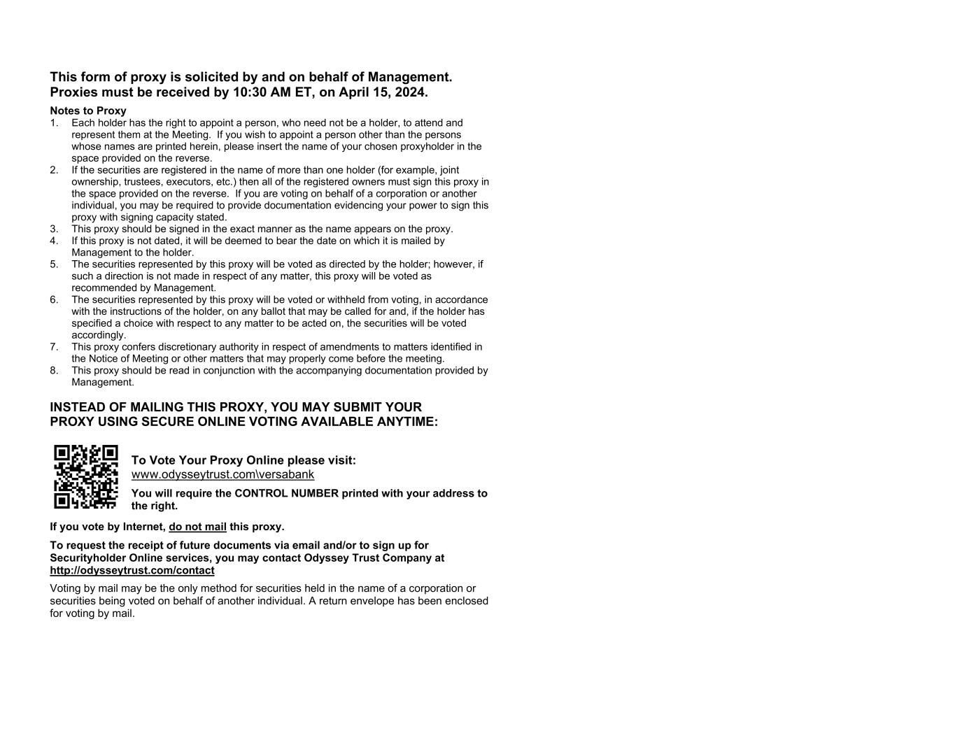 This form of proxy is solicited by and on behalf of Management. Proxies must be received by 10:30 AM ET, on April 15, 2024. Notes to Proxy 1. Each holder has the right to appoint a person, who need not be a holder, to attend and represent them at the Meeting. If you wish to appoint a person other than the persons whose names are printed herein, please insert the name of your chosen proxyholder in the space provided on the reverse. 2. If the securities are registered in the name of more than one holder (for example, joint ownership, trustees, executors, etc.) then all of the registered owners must sign this proxy in the space provided on the reverse. If you are voting on behalf of a corporation or another individual, you may be required to provide documentation evidencing your power to sign this proxy with signing capacity stated. 3. This proxy should be signed in the exact manner as the name appears on the proxy. 4. If this proxy is not dated, it will be deemed to bear the date on which it is mailed by Management to the holder. 5. The securities represented by this proxy will be voted as directed by the holder; however, if such a direction is not made in respect of any matter, this proxy will be voted as recommended by Management. 6. The securities represented by this proxy will be voted or withheld from voting, in accordance with the instructions of the holder, on any ballot that may be called for and, if the holder has specified a choice with respect to any matter to be acted on, the securities will be voted accordingly. 7. This proxy confers discretionary authority in respect of amendments to matters identified in the Notice of Meeting or other matters that may properly come before the meeting. 8. This proxy should be read in conjunction with the accompanying documentation provided by Management. INSTEAD OF MAILING THIS PROXY, YOU MAY SUBMIT YOUR PROXY USING SECURE ONLINE VOTING AVAILABLE ANYTIME: To Vote Your Proxy Online please visit: www.odysseytrust.com\versabank You will require the CONTROL NUMBER printed with your address to the right. If you vote by Internet, do not mail this proxy. To request the receipt of future documents via email and/or to sign up for Securityholder Online services, you may contact Odyssey Trust Company at http://odysseytrust.com/contact Voting by mail may be the only method for securities held in the name of a corporation or securities being voted on behalf of another individual. A return envelope has been enclosed for voting by mail.