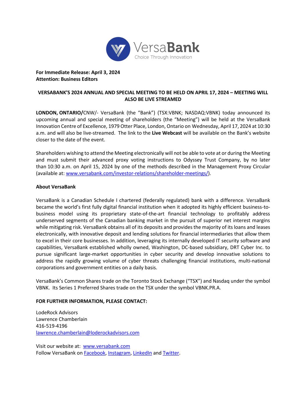 For Immediate Release: April 3, 2024 Attention: Business Editors VERSABANK’S 2024 ANNUAL AND SPECIAL MEETING TO BE HELD ON APRIL 17, 2024 – MEETING WILL ALSO BE LIVE STREAMED LONDON, ONTARIO/CNW/- VersaBank (the “Bank”) (TSX:VBNK; NASDAQ:VBNK) today announced its upcoming annual and special meeting of shareholders (the “Meeting”) will be held at the VersaBank Innovation Centre of Excellence, 1979 Otter Place, London, Ontario on Wednesday, April 17, 2024 at 10:30 a.m. and will also be live-streamed. The link to the Live Webcast will be available on the Bank’s website closer to the date of the event. Shareholders wishing to attend the Meeting electronically will not be able to vote at or during the Meeting and must submit their advanced proxy voting instructions to Odyssey Trust Company, by no later than 10:30 a.m. on April 15, 2024 by one of the methods described in the Management Proxy Circular (available at: www.versabank.com/investor-relations/shareholder-meetings/). About VersaBank VersaBank is a Canadian Schedule I chartered (federally regulated) bank with a difference. VersaBank became the world’s first fully digital financial institution when it adopted its highly efficient business-to- business model using its proprietary state-of-the-art financial technology to profitably address underserved segments of the Canadian banking market in the pursuit of superior net interest margins while mitigating risk. VersaBank obtains all of its deposits and provides the majority of its loans and leases electronically, with innovative deposit and lending solutions for financial intermediaries that allow them to excel in their core businesses. In addition, leveraging its internally developed IT security software and capabilities, VersaBank established wholly owned, Washington, DC-based subsidiary, DRT Cyber Inc. to pursue significant large-market opportunities in cyber security and develop innovative solutions to address the rapidly growing volume of cyber threats challenging financial institutions, multi-national corporations and government entities on a daily basis. VersaBank’s Common Shares trade on the Toronto Stock Exchange (“TSX”) and Nasdaq under the symbol VBNK. Its Series 1 Preferred Shares trade on the TSX under the symbol VBNK.PR.A. FOR FURTHER INFORMATION, PLEASE CONTACT: LodeRock Advisors Lawrence Chamberlain 416-519-4196 lawrence.chamberlain@loderockadvisors.com Visit our website at: www.versabank.com Follow VersaBank on Facebook, Instagram, LinkedIn and Twitter.