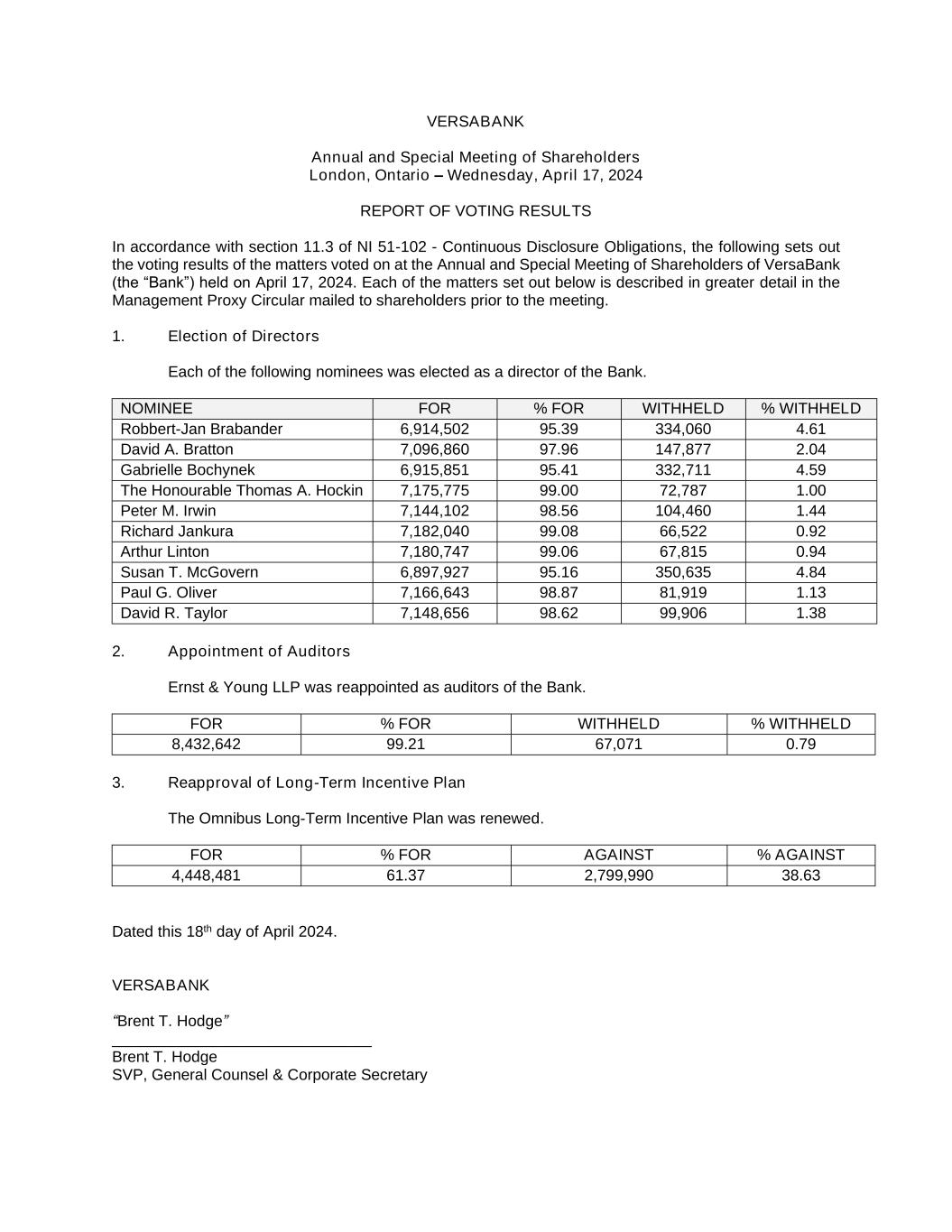 VERSABANK Annual and Special Meeting of Shareholders London, Ontario – Wednesday, April 17, 2024 REPORT OF VOTING RESULTS In accordance with section 11.3 of NI 51-102 - Continuous Disclosure Obligations, the following sets out the voting results of the matters voted on at the Annual and Special Meeting of Shareholders of VersaBank (the “Bank”) held on April 17, 2024. Each of the matters set out below is described in greater detail in the Management Proxy Circular mailed to shareholders prior to the meeting. 1. Election of Directors Each of the following nominees was elected as a director of the Bank. NOMINEE FOR % FOR WITHHELD % WITHHELD Robbert-Jan Brabander 6,914,502 95.39 334,060 4.61 David A. Bratton 7,096,860 97.96 147,877 2.04 Gabrielle Bochynek 6,915,851 95.41 332,711 4.59 The Honourable Thomas A. Hockin 7,175,775 99.00 72,787 1.00 Peter M. Irwin 7,144,102 98.56 104,460 1.44 Richard Jankura 7,182,040 99.08 66,522 0.92 Arthur Linton 7,180,747 99.06 67,815 0.94 Susan T. McGovern 6,897,927 95.16 350,635 4.84 Paul G. Oliver 7,166,643 98.87 81,919 1.13 David R. Taylor 7,148,656 98.62 99,906 1.38 2. Appointment of Auditors Ernst & Young LLP was reappointed as auditors of the Bank. FOR % FOR WITHHELD % WITHHELD 8,432,642 99.21 67,071 0.79 3. Reapproval of Long-Term Incentive Plan The Omnibus Long-Term Incentive Plan was renewed. FOR % FOR AGAINST % AGAINST 4,448,481 61.37 2,799,990 38.63 Dated this 18th day of April 2024. VERSABANK “Brent T. Hodge” ______________________________ Brent T. Hodge SVP, General Counsel & Corporate Secretary