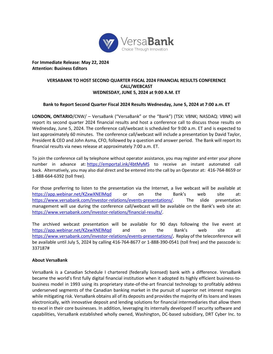 For Immediate Release: May 22, 2024 Attention: Business Editors VERSABANK TO HOST SECOND QUARTER FISCAL 2024 FINANCIAL RESULTS CONFERENCE CALL/WEBCAST WEDNESDAY, JUNE 5, 2024 at 9:00 A.M. ET Bank to Report Second Quarter Fiscal 2024 Results Wednesday, June 5, 2024 at 7:00 a.m. ET LONDON, ONTARIO/CNW/ – VersaBank (“VersaBank” or the “Bank”) (TSX: VBNK; NASDAQ: VBNK) will report its second quarter 2024 financial results and host a conference call to discuss those results on Wednesday, June 5, 2024. The conference call/webcast is scheduled for 9:00 a.m. ET and is expected to last approximately 60 minutes. The conference call/webcast will include a presentation by David Taylor, President & CEO and John Asma, CFO, followed by a question and answer period. The Bank will report its financial results via news release at approximately 7:00 a.m. ET. To join the conference call by telephone without operator assistance, you may register and enter your phone number in advance at: https://emportal.ink/4btMyMS to receive an instant automated call back. Alternatively, you may also dial direct and be entered into the call by an Operator at: 416-764-8659 or 1-888-664-6392 (toll free). For those preferring to listen to the presentation via the Internet, a live webcast will be available at https://app.webinar.net/KZxwXNElMqd or on the Bank’s web site at: https://www.versabank.com/investor-relations/events-presentations/. The slide presentation management will use during the conference call/webcast will be available on the Bank’s web site at: https://www.versabank.com/investor-relations/financial-results/. The archived webcast presentation will be available for 90 days following the live event at https://app.webinar.net/KZxwXNElMqd and on the Bank’s web site at: https://www.versabank.com/investor-relations/events-presentations/. Replay of the teleconference will be available until July 5, 2024 by calling 416-764-8677 or 1-888-390-0541 (toll free) and the passcode is: 337187# About VersaBank VersaBank is a Canadian Schedule I chartered (federally licensed) bank with a difference. VersaBank became the world’s first fully digital financial institution when it adopted its highly efficient business-to- business model in 1993 using its proprietary state-of-the-art financial technology to profitably address underserved segments of the Canadian banking market in the pursuit of superior net interest margins while mitigating risk. VersaBank obtains all of its deposits and provides the majority of its loans and leases electronically, with innovative deposit and lending solutions for financial intermediaries that allow them to excel in their core businesses. In addition, leveraging its internally developed IT security software and capabilities, VersaBank established wholly owned, Washington, DC-based subsidiary, DRT Cyber Inc. to