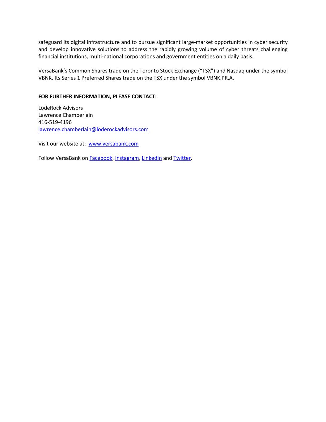 safeguard its digital infrastructure and to pursue significant large-market opportunities in cyber security and develop innovative solutions to address the rapidly growing volume of cyber threats challenging financial institutions, multi-national corporations and government entities on a daily basis. VersaBank’s Common Shares trade on the Toronto Stock Exchange (“TSX”) and Nasdaq under the symbol VBNK. Its Series 1 Preferred Shares trade on the TSX under the symbol VBNK.PR.A. FOR FURTHER INFORMATION, PLEASE CONTACT: LodeRock Advisors Lawrence Chamberlain 416-519-4196 lawrence.chamberlain@loderockadvisors.com Visit our website at: www.versabank.com Follow VersaBank on Facebook, Instagram, LinkedIn and Twitter.