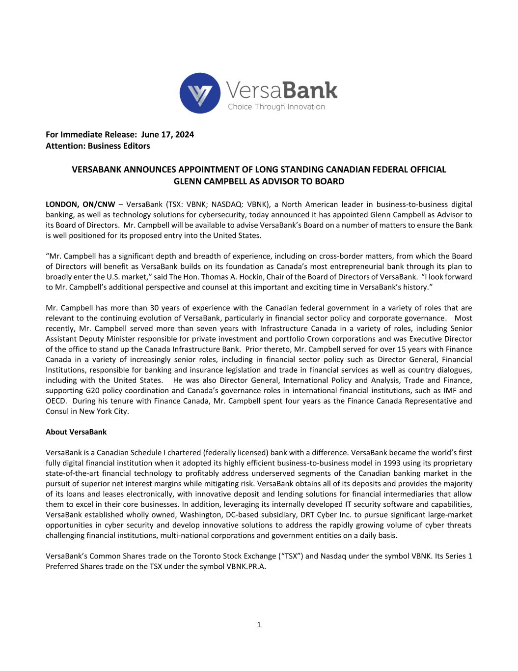 1 For Immediate Release: June 17, 2024 Attention: Business Editors VERSABANK ANNOUNCES APPOINTMENT OF LONG STANDING CANADIAN FEDERAL OFFICIAL GLENN CAMPBELL AS ADVISOR TO BOARD LONDON, ON/CNW – VersaBank (TSX: VBNK; NASDAQ: VBNK), a North American leader in business-to-business digital banking, as well as technology solutions for cybersecurity, today announced it has appointed Glenn Campbell as Advisor to its Board of Directors. Mr. Campbell will be available to advise VersaBank’s Board on a number of matters to ensure the Bank is well positioned for its proposed entry into the United States. “Mr. Campbell has a significant depth and breadth of experience, including on cross-border matters, from which the Board of Directors will benefit as VersaBank builds on its foundation as Canada’s most entrepreneurial bank through its plan to broadly enter the U.S. market,” said The Hon. Thomas A. Hockin, Chair of the Board of Directors of VersaBank. “I look forward to Mr. Campbell’s additional perspective and counsel at this important and exciting time in VersaBank’s history.” Mr. Campbell has more than 30 years of experience with the Canadian federal government in a variety of roles that are relevant to the continuing evolution of VersaBank, particularly in financial sector policy and corporate governance. Most recently, Mr. Campbell served more than seven years with Infrastructure Canada in a variety of roles, including Senior Assistant Deputy Minister responsible for private investment and portfolio Crown corporations and was Executive Director of the office to stand up the Canada Infrastructure Bank. Prior thereto, Mr. Campbell served for over 15 years with Finance Canada in a variety of increasingly senior roles, including in financial sector policy such as Director General, Financial Institutions, responsible for banking and insurance legislation and trade in financial services as well as country dialogues, including with the United States. He was also Director General, International Policy and Analysis, Trade and Finance, supporting G20 policy coordination and Canada’s governance roles in international financial institutions, such as IMF and OECD. During his tenure with Finance Canada, Mr. Campbell spent four years as the Finance Canada Representative and Consul in New York City. About VersaBank VersaBank is a Canadian Schedule I chartered (federally licensed) bank with a difference. VersaBank became the world’s first fully digital financial institution when it adopted its highly efficient business-to-business model in 1993 using its proprietary state-of-the-art financial technology to profitably address underserved segments of the Canadian banking market in the pursuit of superior net interest margins while mitigating risk. VersaBank obtains all of its deposits and provides the majority of its loans and leases electronically, with innovative deposit and lending solutions for financial intermediaries that allow them to excel in their core businesses. In addition, leveraging its internally developed IT security software and capabilities, VersaBank established wholly owned, Washington, DC-based subsidiary, DRT Cyber Inc. to pursue significant large-market opportunities in cyber security and develop innovative solutions to address the rapidly growing volume of cyber threats challenging financial institutions, multi-national corporations and government entities on a daily basis. VersaBank’s Common Shares trade on the Toronto Stock Exchange (“TSX”) and Nasdaq under the symbol VBNK. Its Series 1 Preferred Shares trade on the TSX under the symbol VBNK.PR.A.