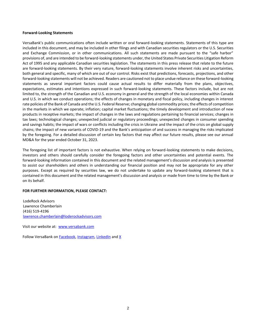 2 Forward-Looking Statements VersaBank’s public communications often include written or oral forward-looking statements. Statements of this type are included in this document, and may be included in other filings and with Canadian securities regulators or the U.S. Securities and Exchange Commission, or in other communications. All such statements are made pursuant to the “safe harbor” provisions of, and are intended to be forward-looking statements under, the United States Private Securities Litigation Reform Act of 1995 and any applicable Canadian securities legislation. The statements in this press release that relate to the future are forward-looking statements. By their very nature, forward-looking statements involve inherent risks and uncertainties, both general and specific, many of which are out of our control. Risks exist that predictions, forecasts, projections, and other forward-looking statements will not be achieved. Readers are cautioned not to place undue reliance on these forward-looking statements as several important factors could cause actual results to differ materially from the plans, objectives, expectations, estimates and intentions expressed in such forward-looking statements. These factors include, but are not limited to, the strength of the Canadian and U.S. economy in general and the strength of the local economies within Canada and U.S. in which we conduct operations; the effects of changes in monetary and fiscal policy, including changes in interest rate policies of the Bank of Canada and the U.S. Federal Reserve; changing global commodity prices; the effects of competition in the markets in which we operate; inflation; capital market fluctuations; the timely development and introduction of new products in receptive markets; the impact of changes in the laws and regulations pertaining to financial services; changes in tax laws; technological changes; unexpected judicial or regulatory proceedings; unexpected changes in consumer spending and savings habits; the impact of wars or conflicts including the crisis in Ukraine and the impact of the crisis on global supply chains; the impact of new variants of COVID-19 and the Bank’s anticipation of and success in managing the risks implicated by the foregoing. For a detailed discussion of certain key factors that may affect our future results, please see our annual MD&A for the year ended October 31, 2023. The foregoing list of important factors is not exhaustive. When relying on forward-looking statements to make decisions, investors and others should carefully consider the foregoing factors and other uncertainties and potential events. The forward-looking information contained in this document and the related management’s discussion and analysis is presented to assist our shareholders and others in understanding our financial position and may not be appropriate for any other purposes. Except as required by securities law, we do not undertake to update any forward-looking statement that is contained in this document and the related management’s discussion and analysis or made from time to time by the Bank or on its behalf. FOR FURTHER INFORMATION, PLEASE CONTACT: LodeRock Advisors Lawrence Chamberlain (416) 519-4196 lawrence.chamberlain@loderockadvisors.com Visit our website at: www.versabank.com Follow VersaBank on Facebook, Instagram, LinkedIn and X