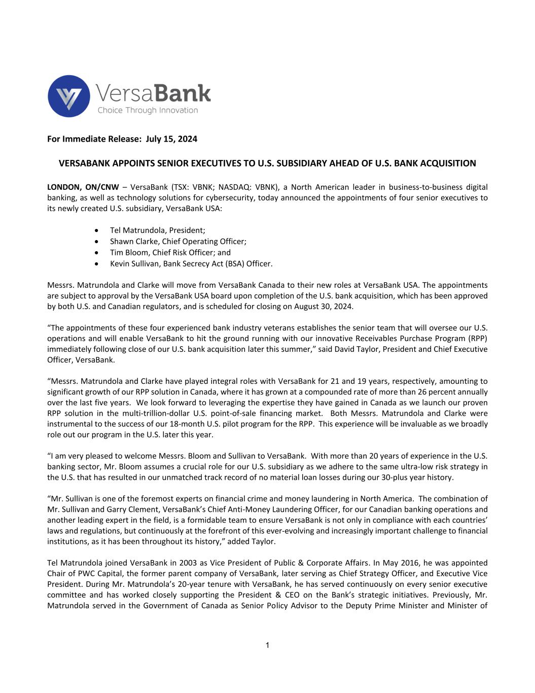 1 For Immediate Release: July 15, 2024 VERSABANK APPOINTS SENIOR EXECUTIVES TO U.S. SUBSIDIARY AHEAD OF U.S. BANK ACQUISITION LONDON, ON/CNW – VersaBank (TSX: VBNK; NASDAQ: VBNK), a North American leader in business-to-business digital banking, as well as technology solutions for cybersecurity, today announced the appointments of four senior executives to its newly created U.S. subsidiary, VersaBank USA: • Tel Matrundola, President; • Shawn Clarke, Chief Operating Officer; • Tim Bloom, Chief Risk Officer; and • Kevin Sullivan, Bank Secrecy Act (BSA) Officer. Messrs. Matrundola and Clarke will move from VersaBank Canada to their new roles at VersaBank USA. The appointments are subject to approval by the VersaBank USA board upon completion of the U.S. bank acquisition, which has been approved by both U.S. and Canadian regulators, and is scheduled for closing on August 30, 2024. “The appointments of these four experienced bank industry veterans establishes the senior team that will oversee our U.S. operations and will enable VersaBank to hit the ground running with our innovative Receivables Purchase Program (RPP) immediately following close of our U.S. bank acquisition later this summer,” said David Taylor, President and Chief Executive Officer, VersaBank. “Messrs. Matrundola and Clarke have played integral roles with VersaBank for 21 and 19 years, respectively, amounting to significant growth of our RPP solution in Canada, where it has grown at a compounded rate of more than 26 percent annually over the last five years. We look forward to leveraging the expertise they have gained in Canada as we launch our proven RPP solution in the multi-trillion-dollar U.S. point-of-sale financing market. Both Messrs. Matrundola and Clarke were instrumental to the success of our 18-month U.S. pilot program for the RPP. This experience will be invaluable as we broadly role out our program in the U.S. later this year. “I am very pleased to welcome Messrs. Bloom and Sullivan to VersaBank. With more than 20 years of experience in the U.S. banking sector, Mr. Bloom assumes a crucial role for our U.S. subsidiary as we adhere to the same ultra-low risk strategy in the U.S. that has resulted in our unmatched track record of no material loan losses during our 30-plus year history. “Mr. Sullivan is one of the foremost experts on financial crime and money laundering in North America. The combination of Mr. Sullivan and Garry Clement, VersaBank’s Chief Anti-Money Laundering Officer, for our Canadian banking operations and another leading expert in the field, is a formidable team to ensure VersaBank is not only in compliance with each countries’ laws and regulations, but continuously at the forefront of this ever-evolving and increasingly important challenge to financial institutions, as it has been throughout its history,” added Taylor. Tel Matrundola joined VersaBank in 2003 as Vice President of Public & Corporate Affairs. In May 2016, he was appointed Chair of PWC Capital, the former parent company of VersaBank, later serving as Chief Strategy Officer, and Executive Vice President. During Mr. Matrundola’s 20-year tenure with VersaBank, he has served continuously on every senior executive committee and has worked closely supporting the President & CEO on the Bank’s strategic initiatives. Previously, Mr. Matrundola served in the Government of Canada as Senior Policy Advisor to the Deputy Prime Minister and Minister of