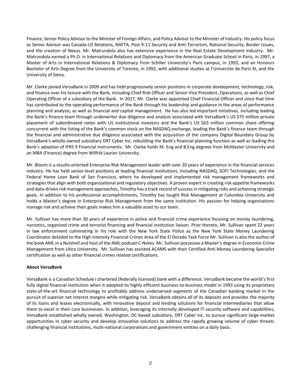 2 Finance, Senior Policy Advisor to the Minister of Foreign Affairs, and Policy Advisor to the Minister of Industry. His policy focus as Senior Advisor was Canada-US Relations, NAFTA, Post 9-11 Security and Anti-Terrorism, National Security, Border Issues, and the creation of Nexus. Mr. Matrundola also has extensive experience in the Real Estate Development Industry. Mr. Matrundola earned a Ph.D. in International Relations and Diplomacy from the American Graduate School in Paris, in 1997, a Master of Arts in International Relations & Diplomacy from Schiller University’s Paris campus, in 1993, and an Honours Bachelor of Arts Degree from the University of Toronto, in 1992, with additional studies at l’Universite de Paris XI, and the University of Siena. Mr. Clarke joined VersaBank in 2009 and has held progressively senior positions in corporate development, technology, risk, and finance over his tenure with the Bank, including Chief Risk Officer and Senior Vice President, Operations, as well as Chief Operating Officer of a subsidiary of the Bank. In 2017, Mr. Clarke was appointed Chief Financial Officer and since that time has contributed to the operating performance of the Bank through his leadership and guidance in the areas of performance planning and analysis, as well as financial and capital management. He has also led important initiatives, including leading the Bank’s finance team through underwriter due diligence and analysis associated with VersaBank’s US $75 million private placement of subordinated notes with US institutional investors and the Bank’s US $63 million common share offering concurrent with the listing of the Bank’s common stock on the NASDAQ exchange, leading the Bank’s finance team through the financial and administrative due diligence associated with the acquisition of the company Digital Boundary Group by VersaBank’s wholly owned subsidiary DRT Cyber Inc. rebuilding the Bank’s financial planning function as well as leading the Bank’s adoption of IFRS 9 Financial Instruments. Mr. Clarke holds M. Eng and B.Eng degrees from McMaster University and an MBA (Finance) degree from Wilfrid Laurier University. Mr. Bloom is a results-oriented Enterprise Risk Management leader with over 20 years of experience in the financial services industry. He has held senior-level positions at leading financial institutions, including NASDAQ, SOFI Technologies, and the Federal Home Loan Bank of San Francisco, where he developed and implemented risk management frameworks and strategies that align with both organizational and regulatory objectives. A proven expert in creating risk appetite frameworks and data-driven risk management approaches, Timothy has a track record of success in mitigating risks and achieving strategic goals. In addition to his professional accomplishments, Timothy has taught Risk Management at Columbia University and holds a Master’s degree in Enterprise Risk Management from the same institution. His passion for helping organizations manage risk and achieve their goals makes him a valuable asset to our team. Mr. Sullivan has more than 30 years of experience in police and financial crime experience focusing on money laundering, narcotics, organized crime and terrorist financing and financial institution liaison. Prior thereto, Mr. Sullivan spent 22 years in law enforcement culminating in his role with the New York State Police as the New York State Money Laundering Coordinator detailed to the High Intensity Financial Crimes Area of the El Dorado Task Force Mr. Sullivan is also the author of the book AML in a Nutshell and host of the AML podcast C-Notes. Mr. Sullivan possesses a Master’s degree in Economic Crime Management from Utica University. Mr. Sullivan has assisted ACAMS with their Certified Anti-Money Laundering Specialist certification as well as other financial crimes related certifications. About VersaBank VersaBank is a Canadian Schedule I chartered (federally licensed) bank with a difference. VersaBank became the world’s first fully digital financial institution when it adopted its highly efficient business-to-business model in 1993 using its proprietary state-of-the-art financial technology to profitably address underserved segments of the Canadian banking market in the pursuit of superior net interest margins while mitigating risk. VersaBank obtains all of its deposits and provides the majority of its loans and leases electronically, with innovative deposit and lending solutions for financial intermediaries that allow them to excel in their core businesses. In addition, leveraging its internally developed IT security software and capabilities, VersaBank established wholly owned, Washington, DC-based subsidiary, DRT Cyber Inc. to pursue significant large-market opportunities in cyber security and develop innovative solutions to address the rapidly growing volume of cyber threats challenging financial institutions, multi-national corporations and government entities on a daily basis.