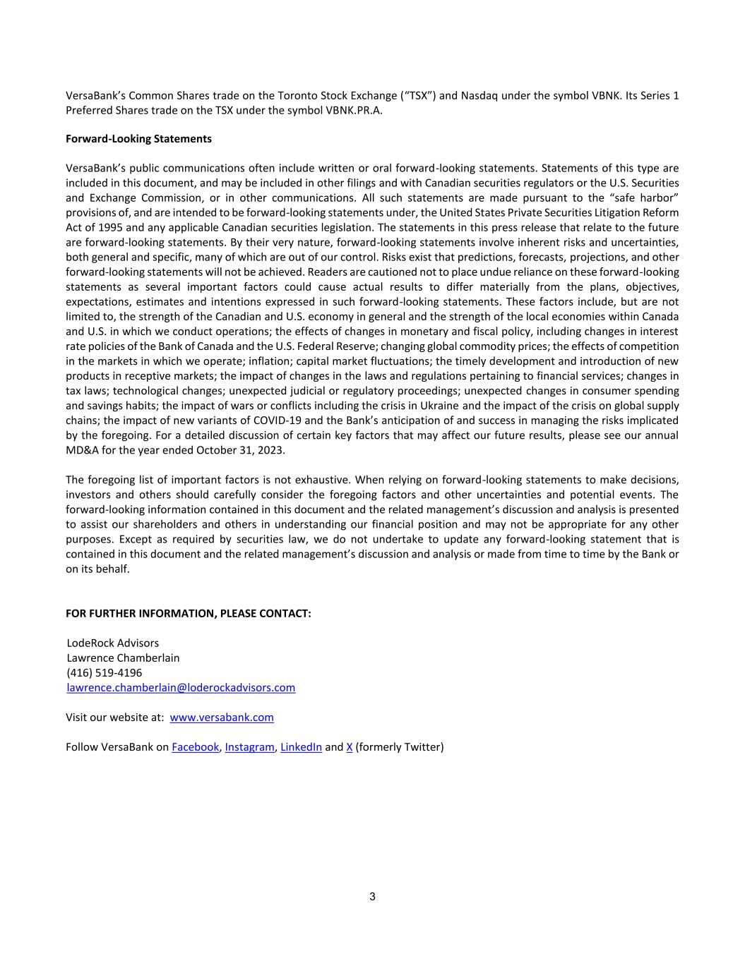 3 VersaBank’s Common Shares trade on the Toronto Stock Exchange (“TSX”) and Nasdaq under the symbol VBNK. Its Series 1 Preferred Shares trade on the TSX under the symbol VBNK.PR.A. Forward-Looking Statements VersaBank’s public communications often include written or oral forward-looking statements. Statements of this type are included in this document, and may be included in other filings and with Canadian securities regulators or the U.S. Securities and Exchange Commission, or in other communications. All such statements are made pursuant to the “safe harbor” provisions of, and are intended to be forward-looking statements under, the United States Private Securities Litigation Reform Act of 1995 and any applicable Canadian securities legislation. The statements in this press release that relate to the future are forward-looking statements. By their very nature, forward-looking statements involve inherent risks and uncertainties, both general and specific, many of which are out of our control. Risks exist that predictions, forecasts, projections, and other forward-looking statements will not be achieved. Readers are cautioned not to place undue reliance on these forward-looking statements as several important factors could cause actual results to differ materially from the plans, objectives, expectations, estimates and intentions expressed in such forward-looking statements. These factors include, but are not limited to, the strength of the Canadian and U.S. economy in general and the strength of the local economies within Canada and U.S. in which we conduct operations; the effects of changes in monetary and fiscal policy, including changes in interest rate policies of the Bank of Canada and the U.S. Federal Reserve; changing global commodity prices; the effects of competition in the markets in which we operate; inflation; capital market fluctuations; the timely development and introduction of new products in receptive markets; the impact of changes in the laws and regulations pertaining to financial services; changes in tax laws; technological changes; unexpected judicial or regulatory proceedings; unexpected changes in consumer spending and savings habits; the impact of wars or conflicts including the crisis in Ukraine and the impact of the crisis on global supply chains; the impact of new variants of COVID-19 and the Bank’s anticipation of and success in managing the risks implicated by the foregoing. For a detailed discussion of certain key factors that may affect our future results, please see our annual MD&A for the year ended October 31, 2023. The foregoing list of important factors is not exhaustive. When relying on forward-looking statements to make decisions, investors and others should carefully consider the foregoing factors and other uncertainties and potential events. The forward-looking information contained in this document and the related management’s discussion and analysis is presented to assist our shareholders and others in understanding our financial position and may not be appropriate for any other purposes. Except as required by securities law, we do not undertake to update any forward-looking statement that is contained in this document and the related management’s discussion and analysis or made from time to time by the Bank or on its behalf. FOR FURTHER INFORMATION, PLEASE CONTACT: LodeRock Advisors Lawrence Chamberlain (416) 519-4196 lawrence.chamberlain@loderockadvisors.com Visit our website at: www.versabank.com Follow VersaBank on Facebook, Instagram, LinkedIn and X (formerly Twitter)
