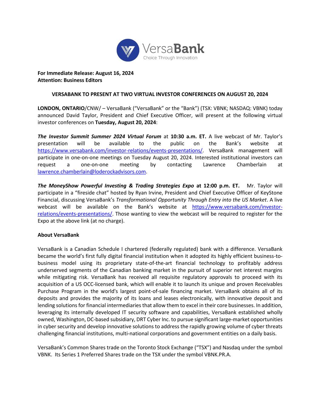 For Immediate Release: August 16, 2024 Attention: Business Editors VERSABANK TO PRESENT AT TWO VIRTUAL INVESTOR CONFERENCES ON AUGUST 20, 2024 LONDON, ONTARIO/CNW/ – VersaBank (“VersaBank” or the “Bank”) (TSX: VBNK; NASDAQ: VBNK) today announced David Taylor, President and Chief Executive Officer, will present at the following virtual investor conferences on Tuesday, August 20, 2024: The Investor Summit Summer 2024 Virtual Forum at 10:30 a.m. ET. A live webcast of Mr. Taylor’s presentation will be available to the public on the Bank’s website at https://www.versabank.com/investor-relations/events-presentations/. VersaBank management will participate in one-on-one meetings on Tuesday August 20, 2024. Interested institutional investors can request a one-on-one meeting by contacting Lawrence Chamberlain at lawrence.chamberlain@loderockadvisors.com. The MoneyShow Powerful Investing & Trading Strategies Expo at 12:00 p.m. ET. Mr. Taylor will participate in a “fireside chat” hosted by Ryan Irvine, President and Chief Executive Officer of KeyStone Financial, discussing VersaBank’s Transformational Opportunity Through Entry into the US Market. A live webcast will be available on the Bank’s website at https://www.versabank.com/investor- relations/events-presentations/. Those wanting to view the webcast will be required to register for the Expo at the above link (at no charge). About VersaBank VersaBank is a Canadian Schedule I chartered (federally regulated) bank with a difference. VersaBank became the world’s first fully digital financial institution when it adopted its highly efficient business-to- business model using its proprietary state-of-the-art financial technology to profitably address underserved segments of the Canadian banking market in the pursuit of superior net interest margins while mitigating risk. VersaBank has received all requisite regulatory approvals to proceed with its acquisition of a US OCC-licensed bank, which will enable it to launch its unique and proven Receivables Purchase Program in the world's largest point-of-sale financing market. VersaBank obtains all of its deposits and provides the majority of its loans and leases electronically, with innovative deposit and lending solutions for financial intermediaries that allow them to excel in their core businesses. In addition, leveraging its internally developed IT security software and capabilities, VersaBank established wholly owned, Washington, DC-based subsidiary, DRT Cyber Inc. to pursue significant large-market opportunities in cyber security and develop innovative solutions to address the rapidly growing volume of cyber threats challenging financial institutions, multi-national corporations and government entities on a daily basis. VersaBank’s Common Shares trade on the Toronto Stock Exchange (“TSX”) and Nasdaq under the symbol VBNK. Its Series 1 Preferred Shares trade on the TSX under the symbol VBNK.PR.A.